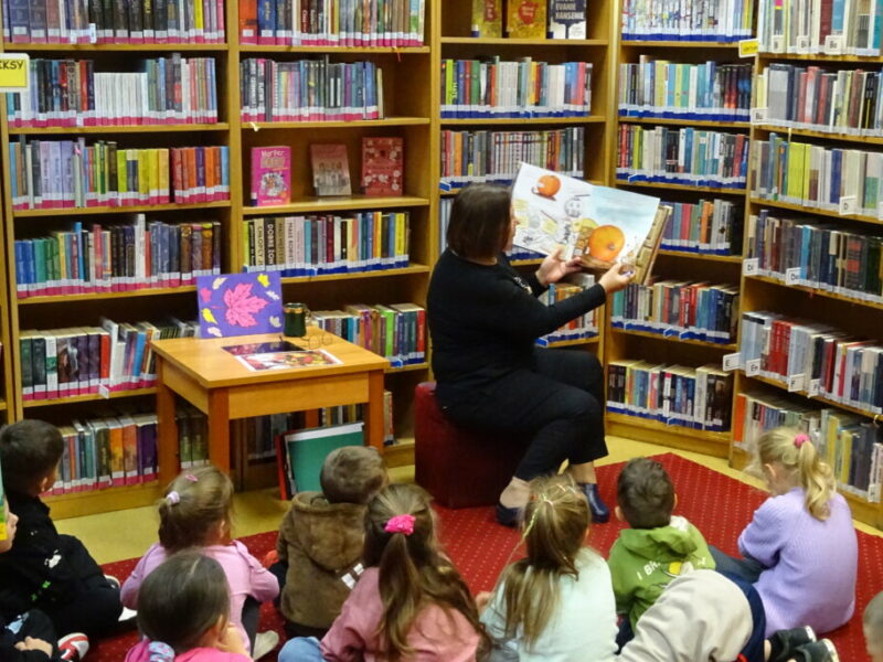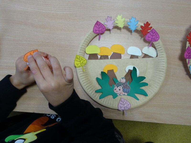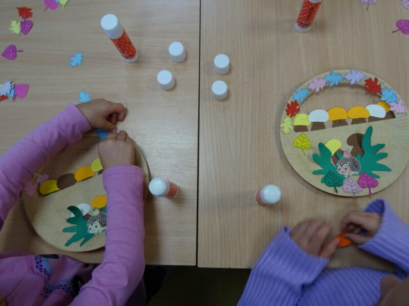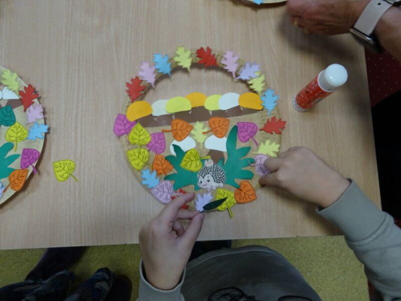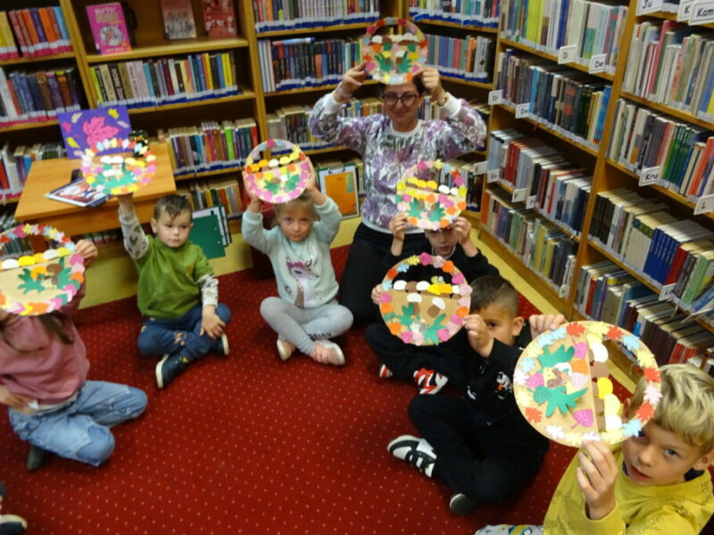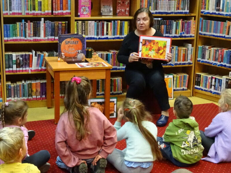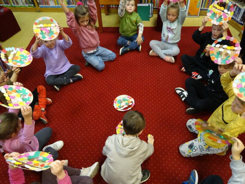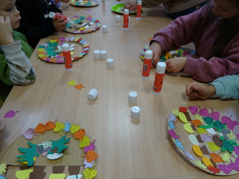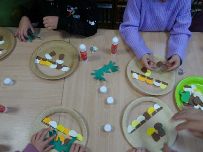 Zajęcia poświęcone tematyce jesieni – jej charakterystycznym cechom, zmianom zachodzącym w przyrodzie oraz różnorodnym gatunkom drzew i darom, jakie przynosi ta pora roku. Uczestnicy mieli okazję porozmawiać o kolorowych liściach, owocach i nasionach oraz o tym, jak zwierzęta przygotowują się do zimy. Ważnym punktem spotkania była wspólna lektura książki Katy Hudson „Śmiały plan Jeża Nieśmiałka”.