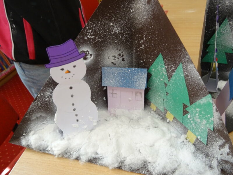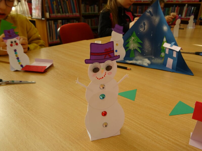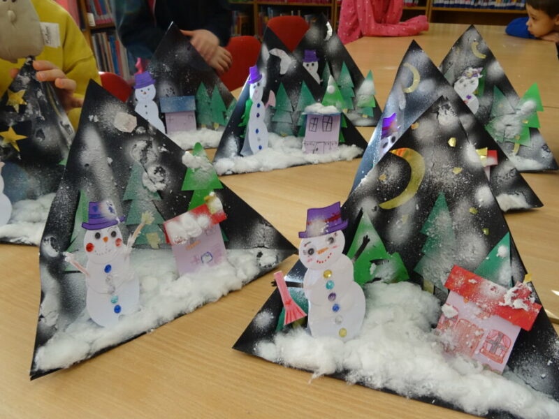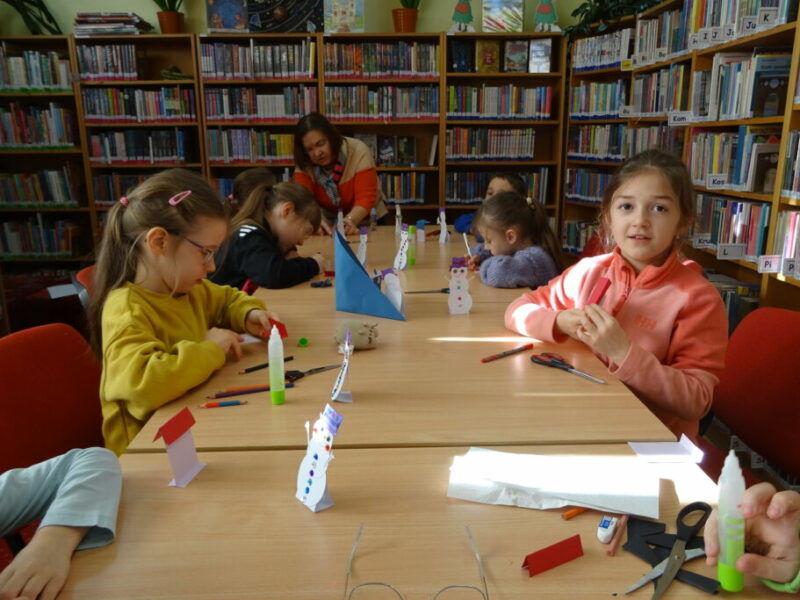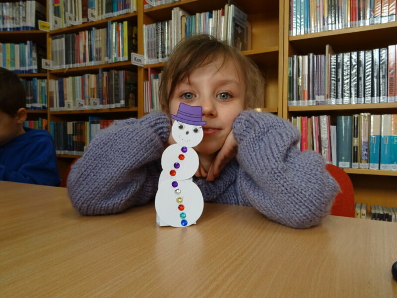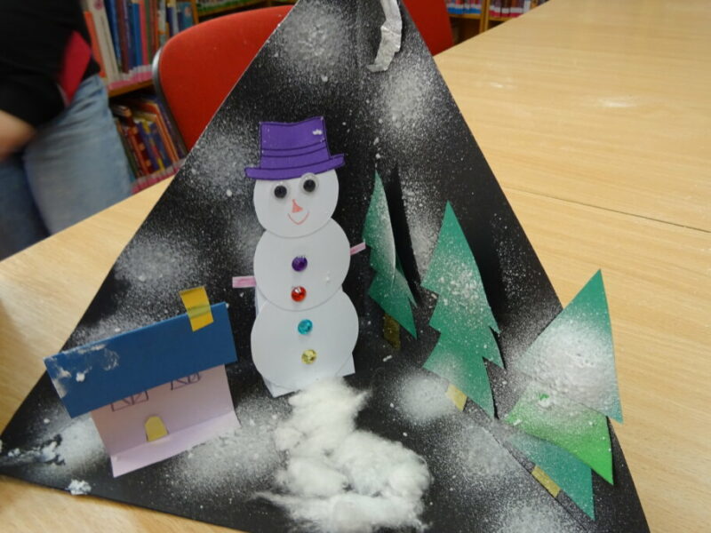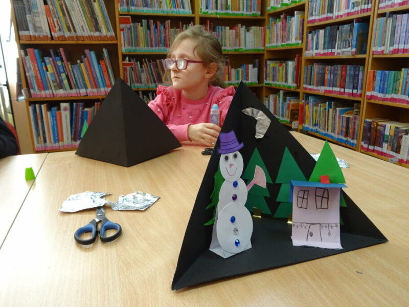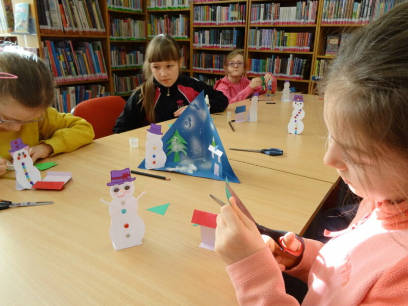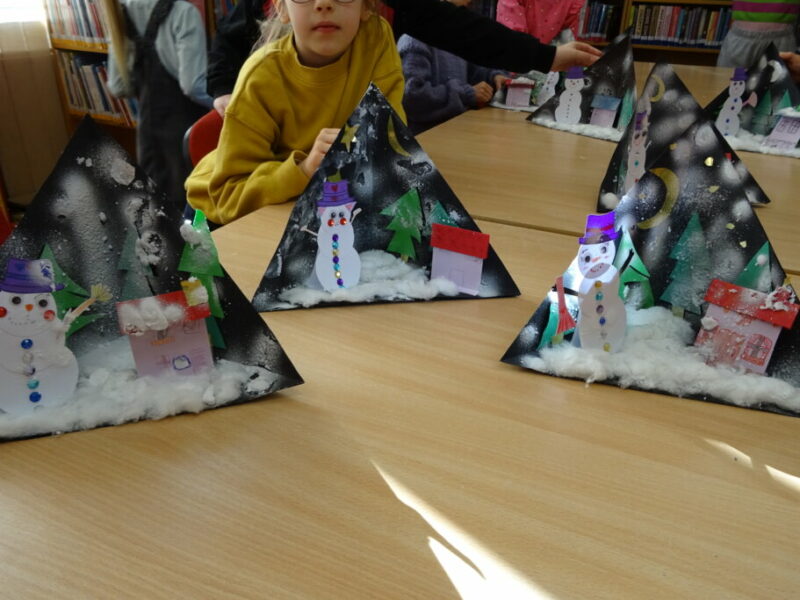 W ramach zajęć z cyklu „Ferie zimowe w Bibliotece” dzieci zaprojektowały przestrzenną pracę plastyczną przedstawiającą zimowy krajobraz.