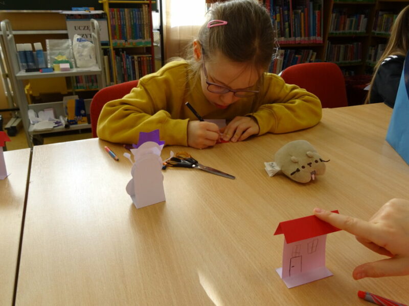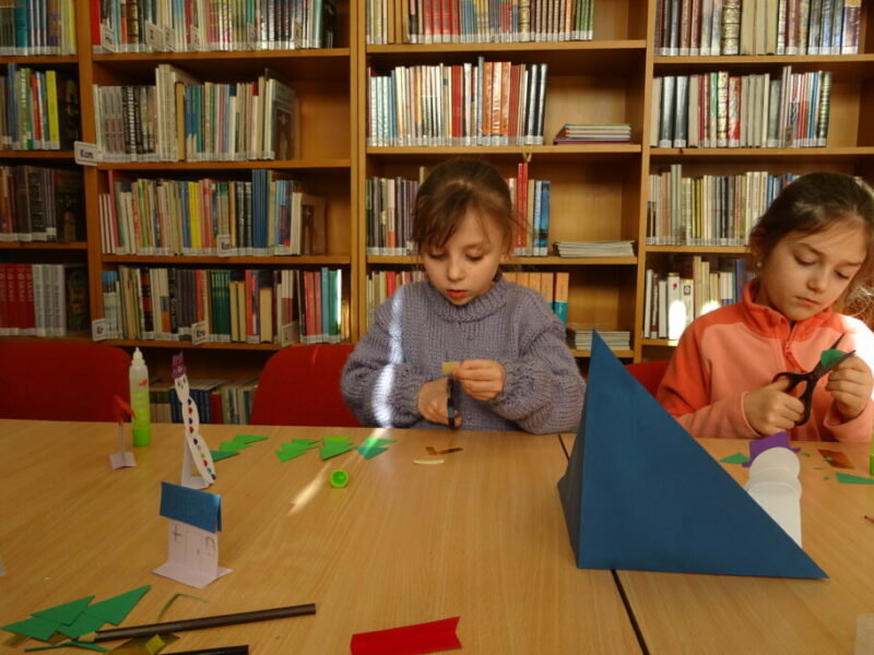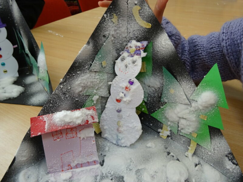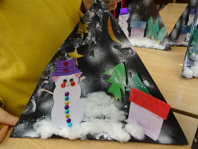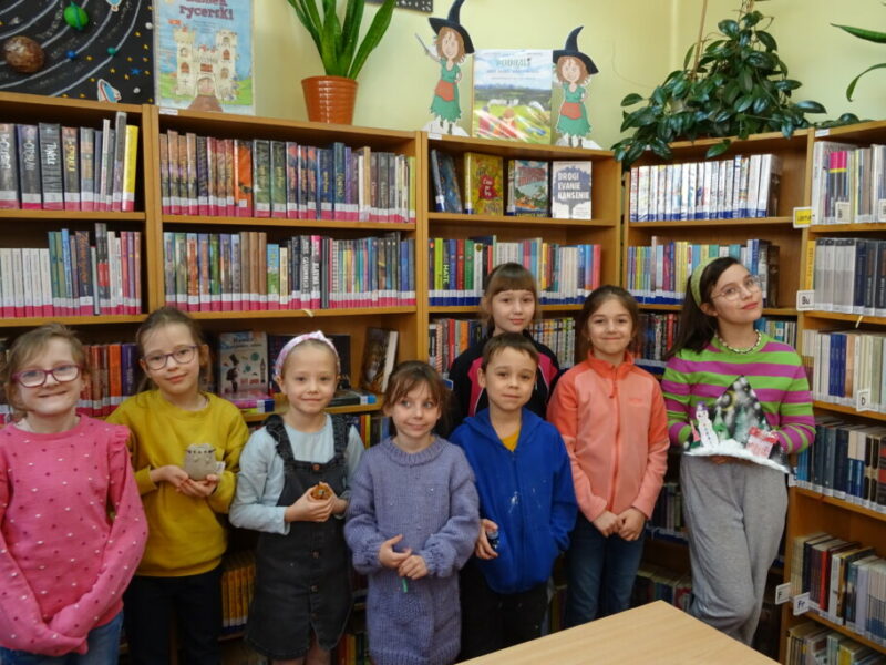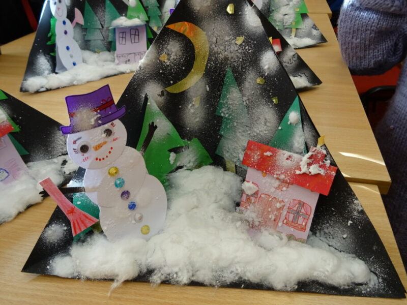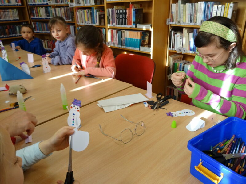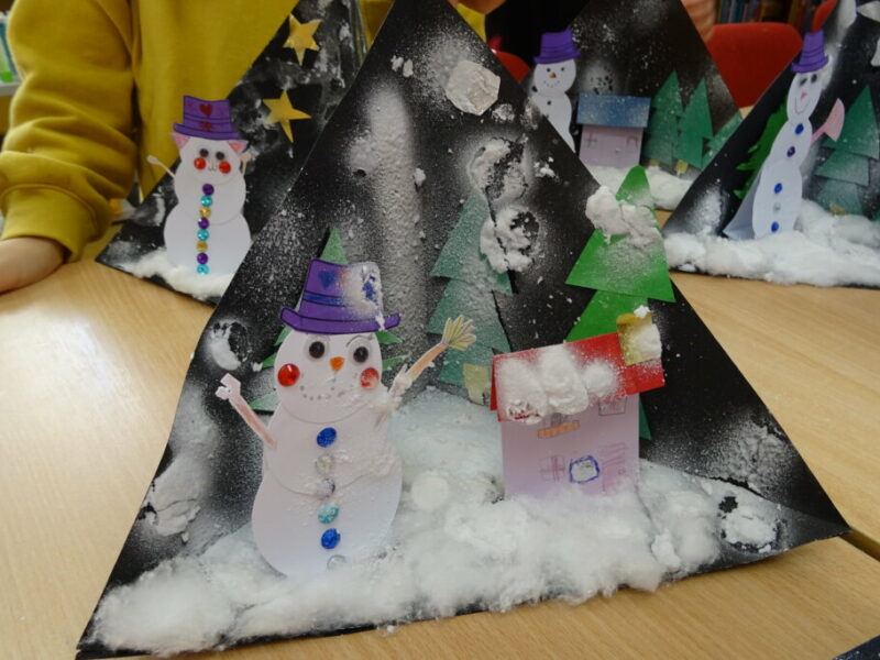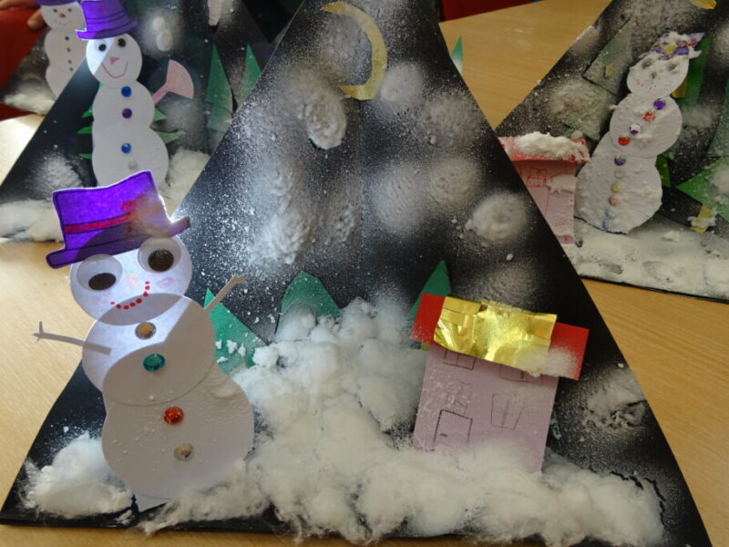 W ramach zajęć z cyklu „Ferie zimowe w Bibliotece” dzieci zaprojektowały przestrzenną pracę plastyczną przedstawiającą zimowy krajobraz.