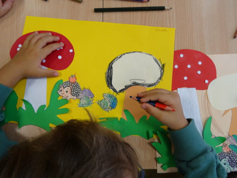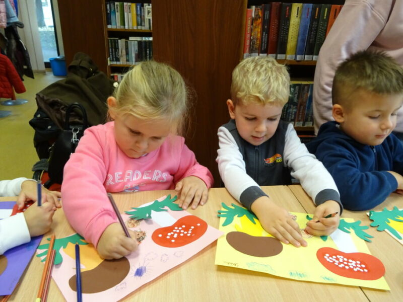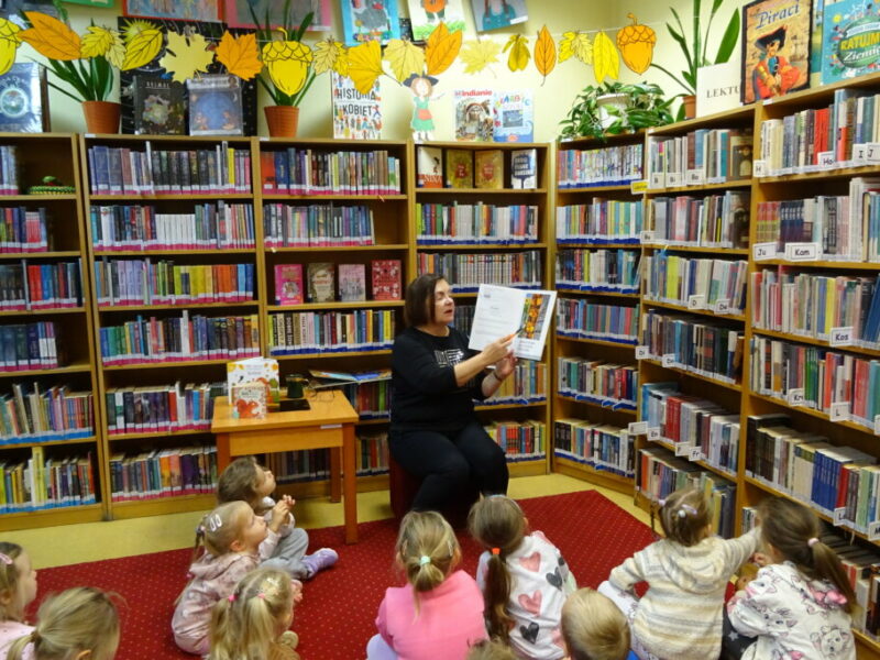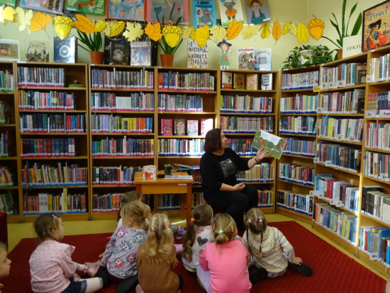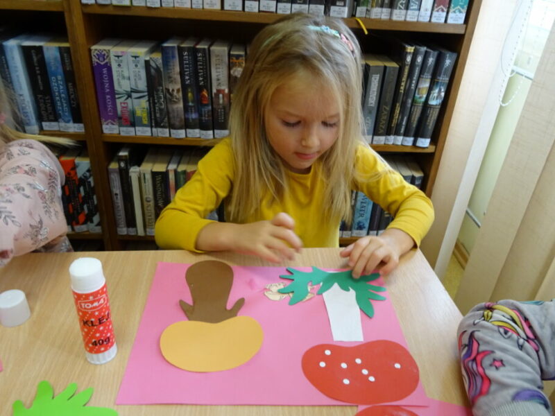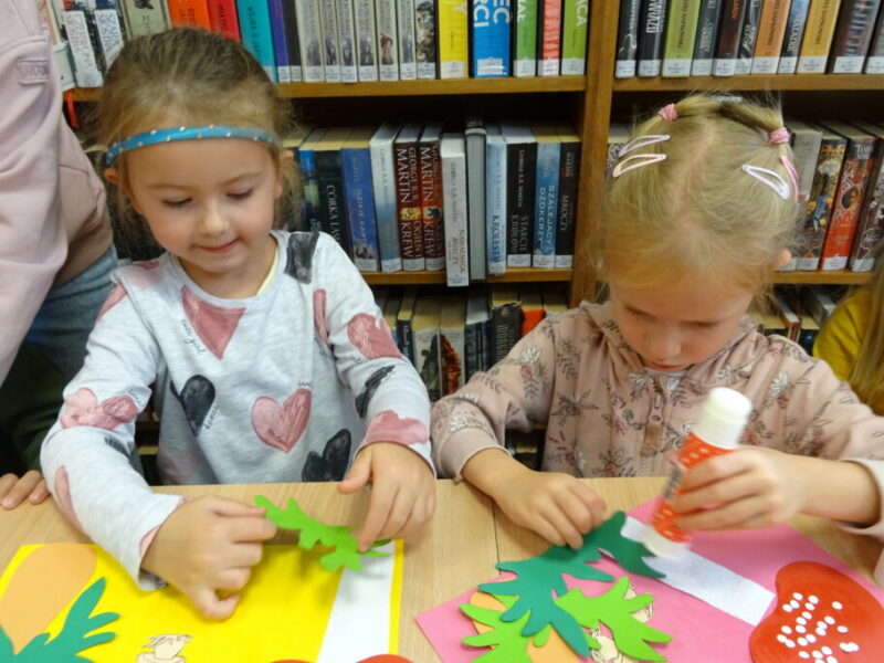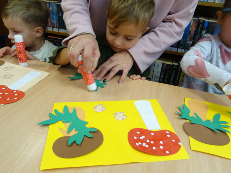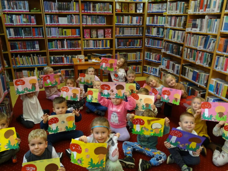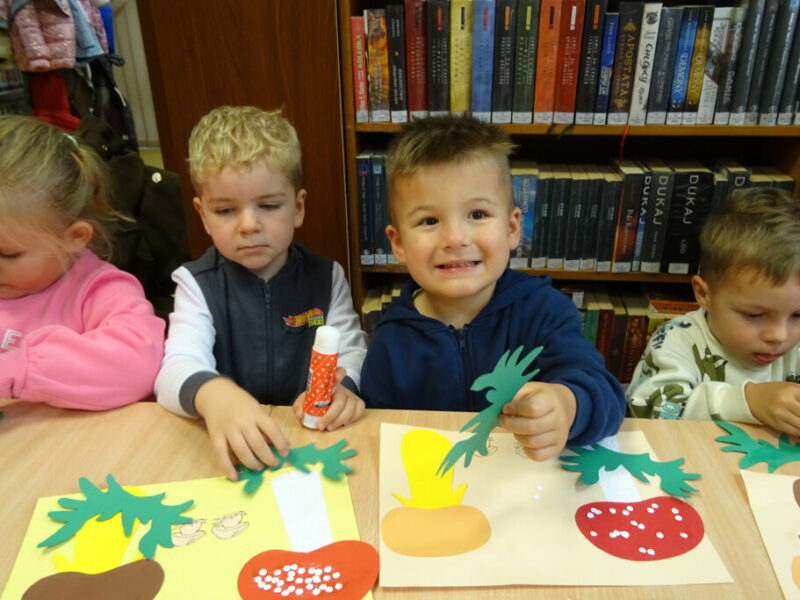 Przedszkolaki zgłębiały jesienne tajemnice lasu. Rozmawiały o tym, co kryje leśna ściółka, poznając grzyby jadalne i trujące. Uczyły się również, dlaczego ostrożność przy ich zbieraniu jest tak ważna. Podczas spotkania czytano i oglądano książki „Jesień” Małgorzaty Strzałkowskiej oraz „Wiewiórka” Katarzyny Piętki z ilustracjami Emilii Dziubak.