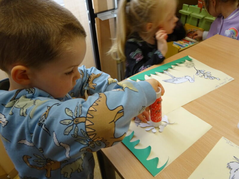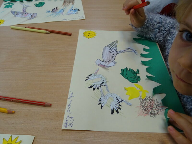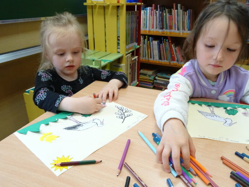 Podczas zajęć o zwiastunach wiosny dzieci odkrywały oznaki cieplejszych dni, takie jak pąki na drzewach, pierwsze kwiaty oraz powracające ptaki. Podczas spotkania czytano książkę „Wiosna” Małgorzaty Strzałkowskiej oraz „Pory roku są fajne” Anny Korycińskiej.