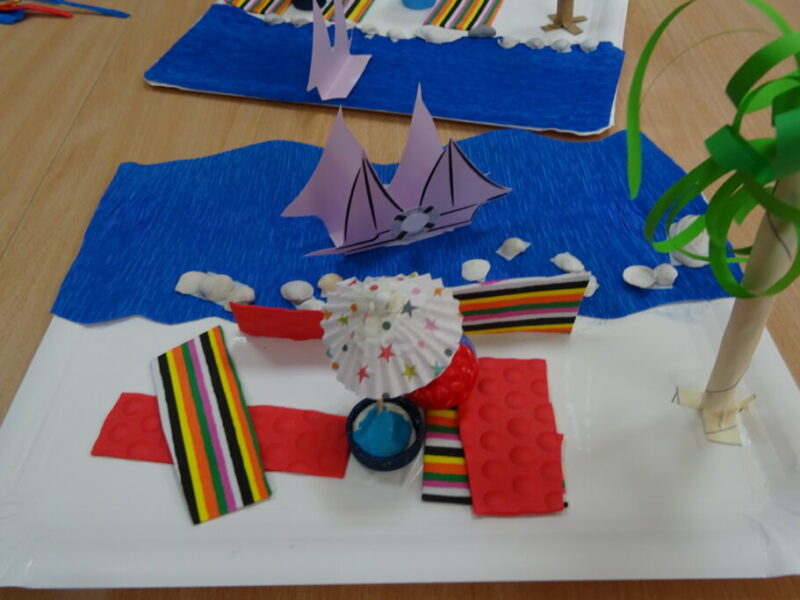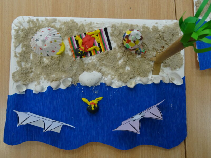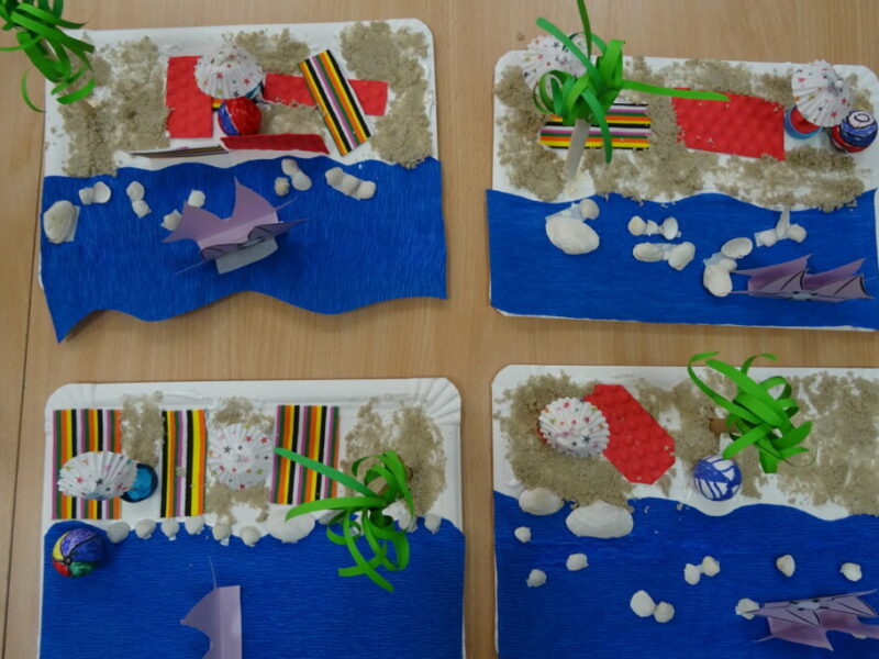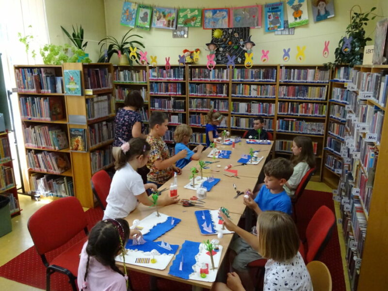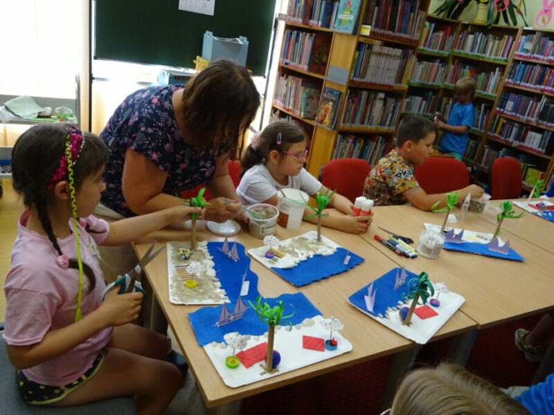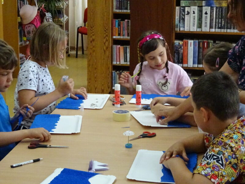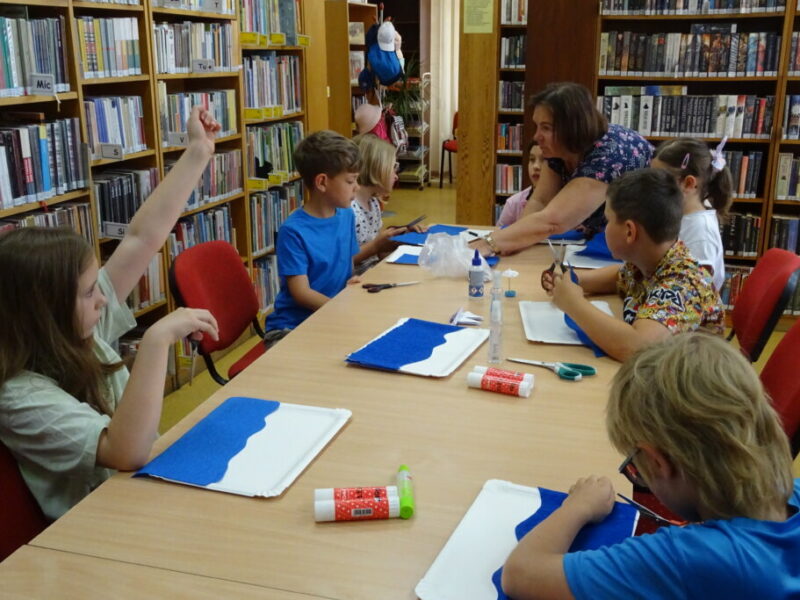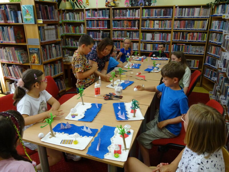 W ramach cyklu Pomysłowe wakacje – biblioteczne atrakcje dzieci wzięły udział w zajęciach edukacyjno-plastycznych. Uczestnicy wykonali prace z wykorzystaniem materiałów papierowych o różnej fakturze i kolorystyce oraz zapoznali się z zasadami bezpieczeństwa na plaży.
