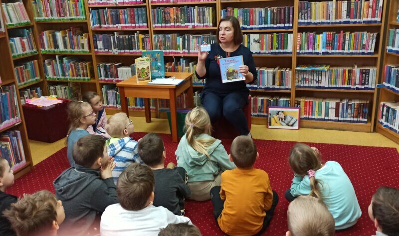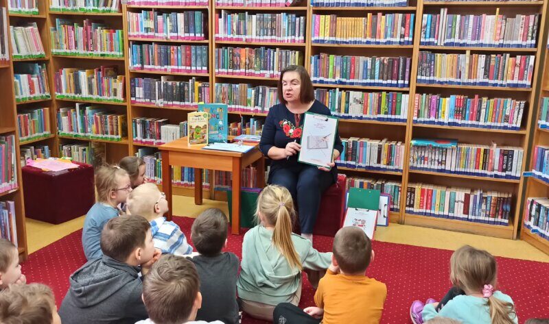 Prezentacja biblioteki oraz jej zbiorów. Zapoznanie z zasadami korzystania z książek. Podczas spotkania czytano książki Sharon Jennings „Franklin i książka z biblioteki” oraz Keri Smith „Wy-kończ tę książkę”.
