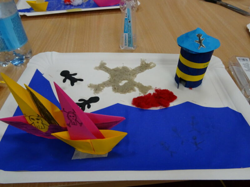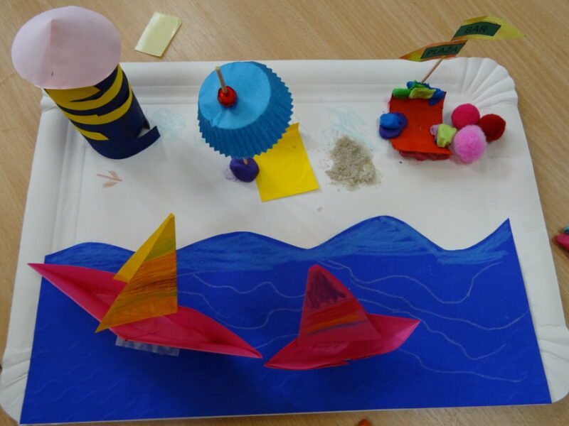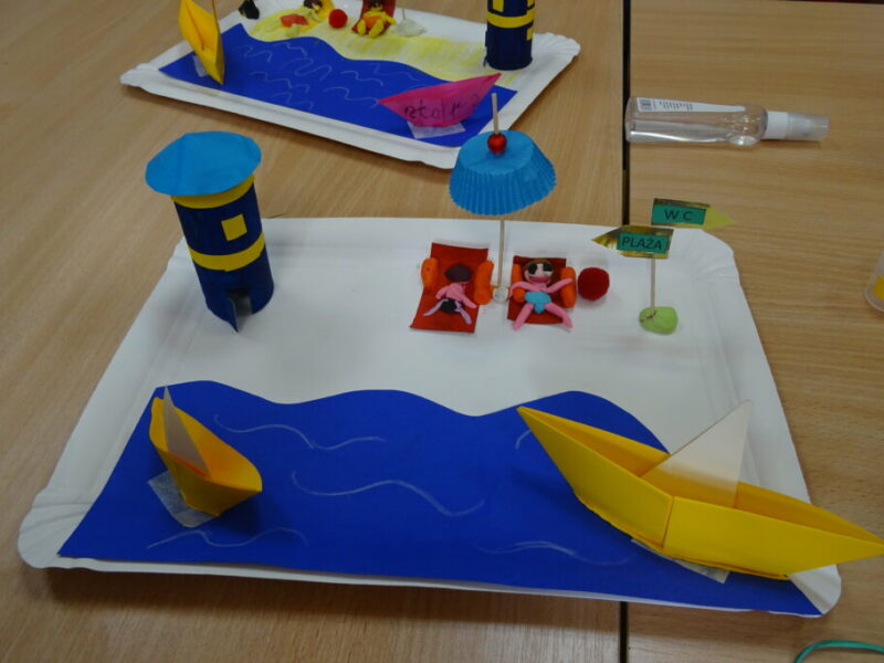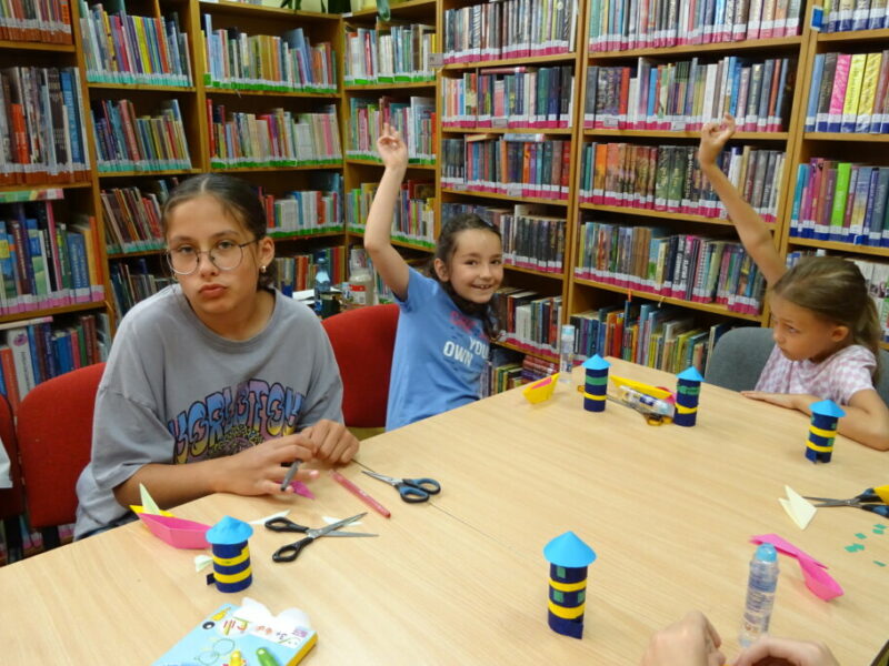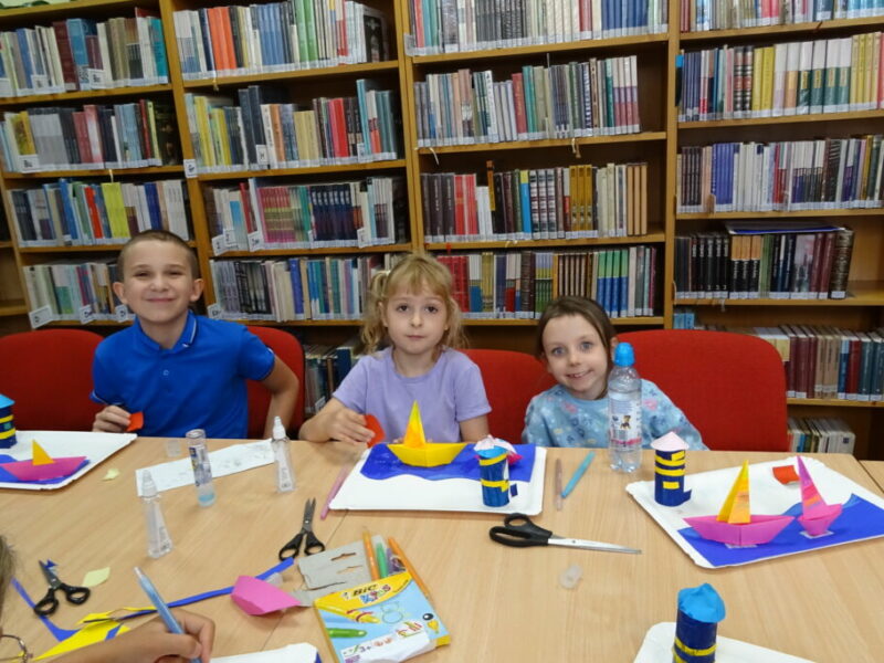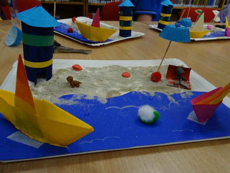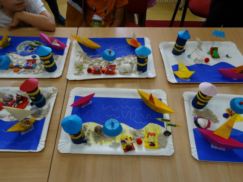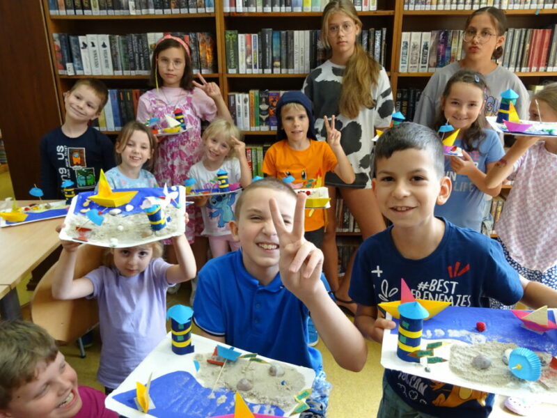 W ramach cyklu „Kreatywne wakacje – biblioteczne atrakcje” dzieci uczestniczyły w zajęciach edukacyjno-plastycznych. Rozwijając swoją wyobraźnię i kreatywność, stworzyły prace przedstawiające nadmorskie scenerie z plażą, latarnią morską i łódką. Do swoich dzieł wykorzystały różnorodne materiały, takie jak plastelina, piasek morski i muszle.
