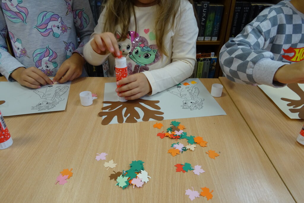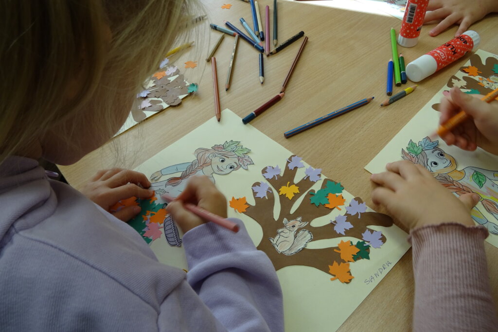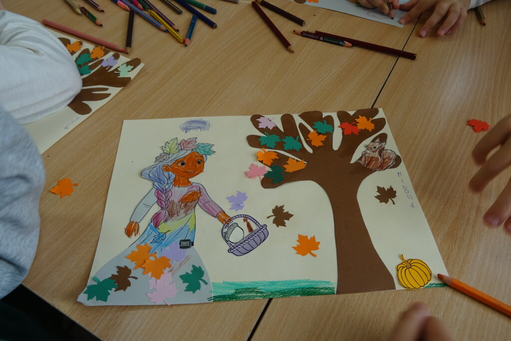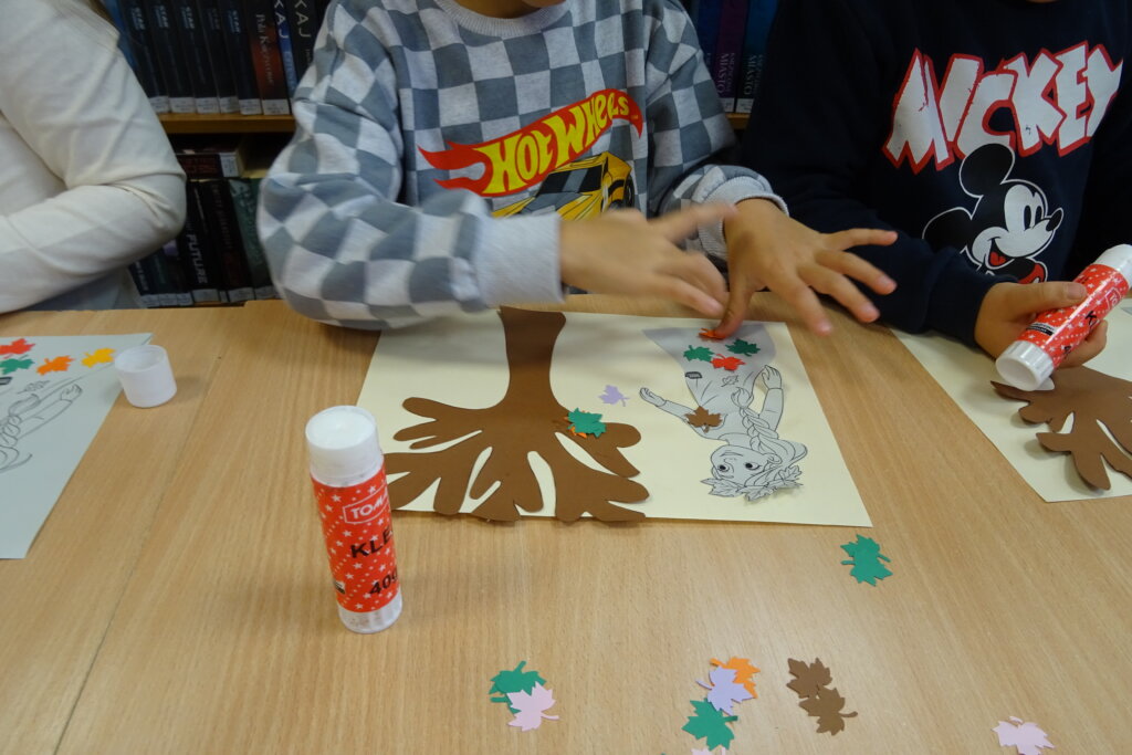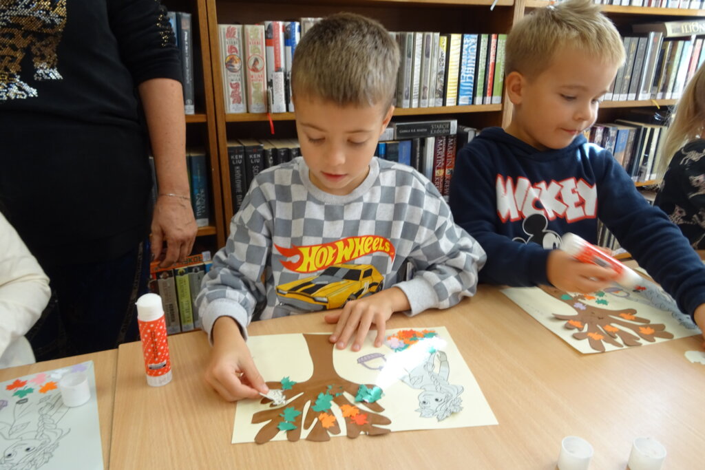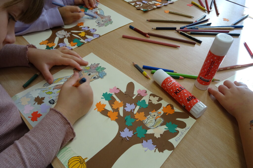 Zajęcia poświęcone tematyce jesieni i zmianom zachodzącym w przyrodzie o tej porze roku. Uczestnicy mieli okazję porozmawiać o leśnych darach jesieni (liściach, owocach, orzechach, grzybach). Podczas spotkania czytano wiersz „Jesień u fryzjera” Danuty Gellnerowej.