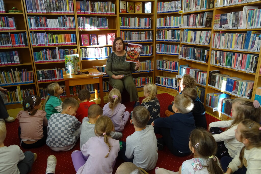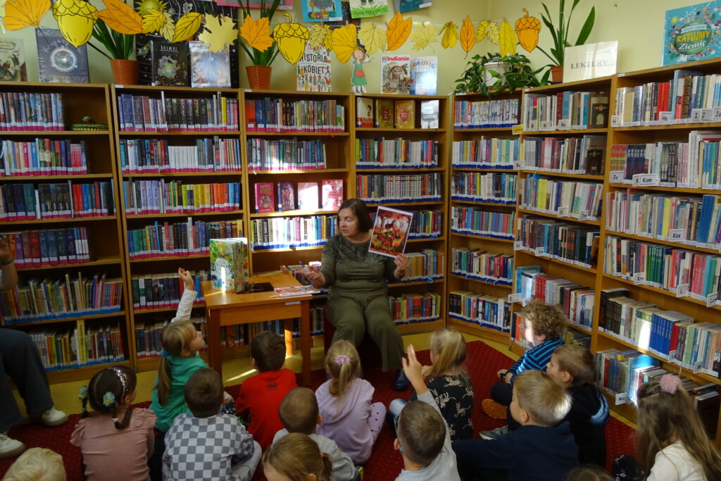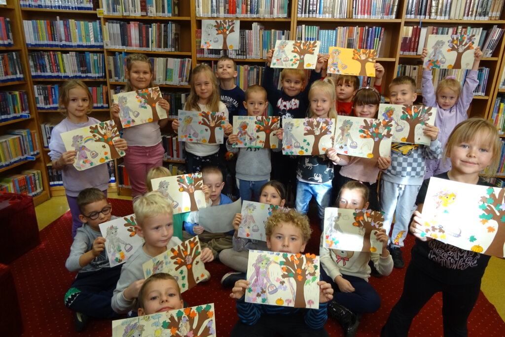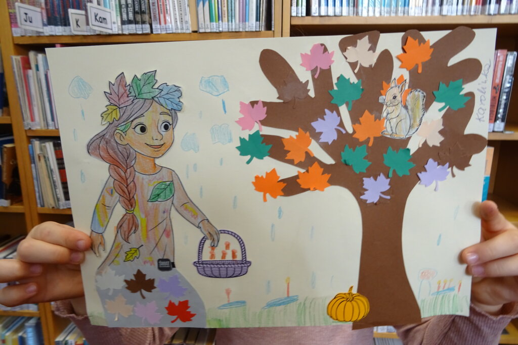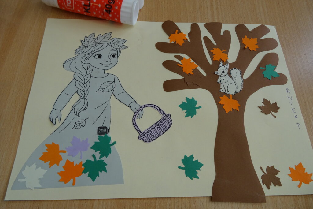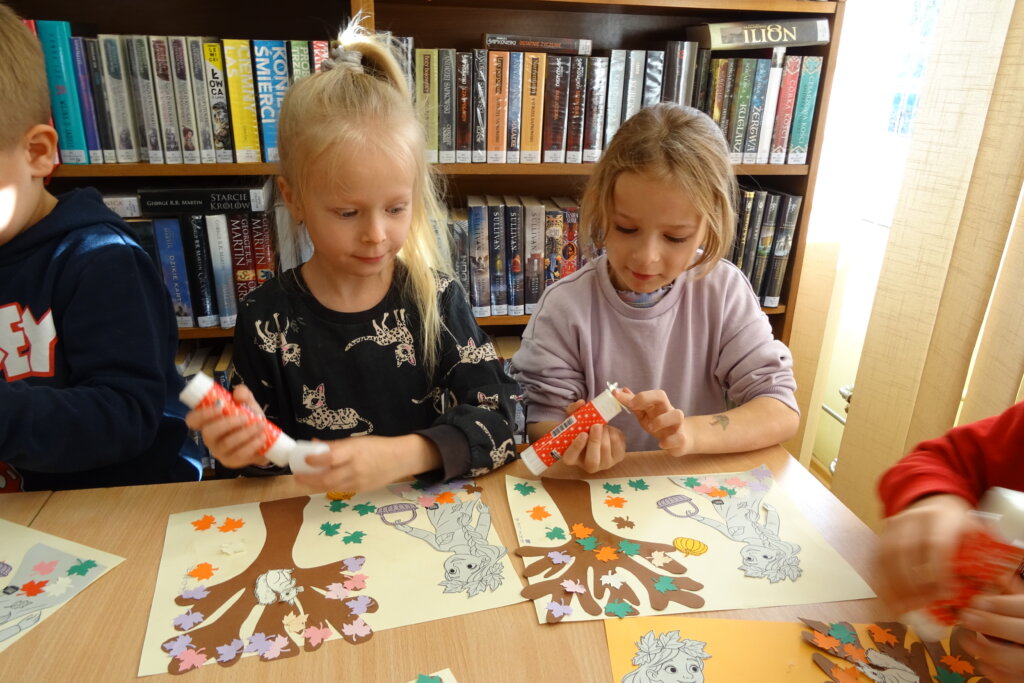 Zajęcia poświęcone tematyce jesieni i zmianom zachodzącym w przyrodzie o tej porze roku. Uczestnicy mieli okazję porozmawiać o leśnych darach jesieni (liściach, owocach, orzechach, grzybach). Podczas spotkania czytano wiersz „Jesień u fryzjera” Danuty Gellnerowej.