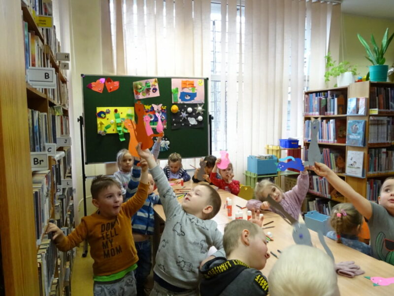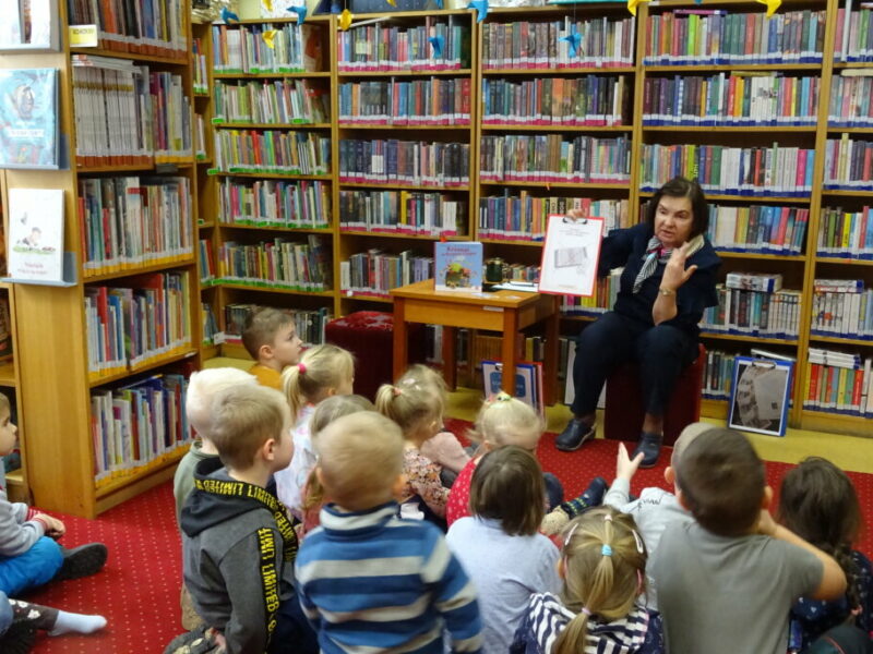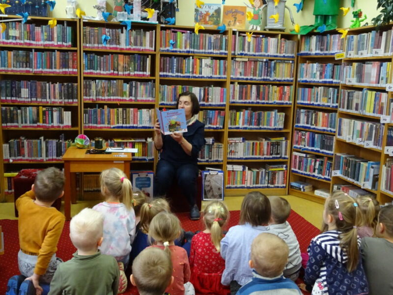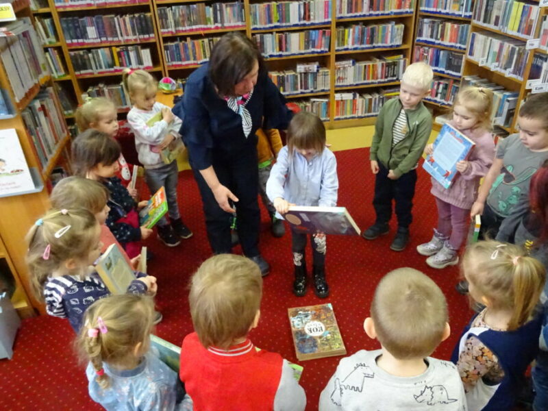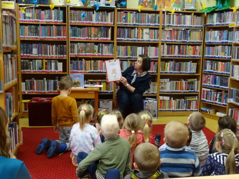 Zajęcia z oferty edukacyjnej prezentujące bibliotekę i jej zbiory, przybliżające zasady korzystania oraz promujące akcję „Mała książka – wielki człowiek”. Przedszkolaki wysłuchały opowiadania o przygodach Franklina w bibliotece oraz wykonały zakładkę kota.
