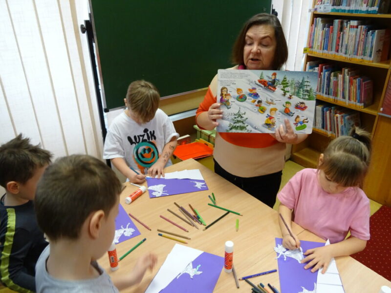 Podczas zajęć dzieci dowiedziały się, jak zwierzęta radzą sobie zimą i jakie zmiany zachodzą w przyrodzie o tej porze roku. W trakcie spotkania czytano książkę „Zima” Anny Fryzowicz-Kotarby i Daniela Włodarskiego.