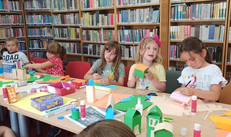 W ramach kolejnych zajęć z cyklu Pomysłowe wakacje – biblioteczne atrakcje dzieci wzięły udział w zajęciach edukacyjno-plastycznych. Zapoznały się z opowiadaniem „Na wiejskim podwórku” Tatiany Jankiewicz. Wykonały prace plastyczne: makiety gospodarstwa wiejskiego przy wykorzystaniu tektury, bibuły, pudełek (stajnia, obora, buda, kurnik). Stworzyły zwierzęta z plasteliny oraz staw z kolorowego papieru i bibuły.