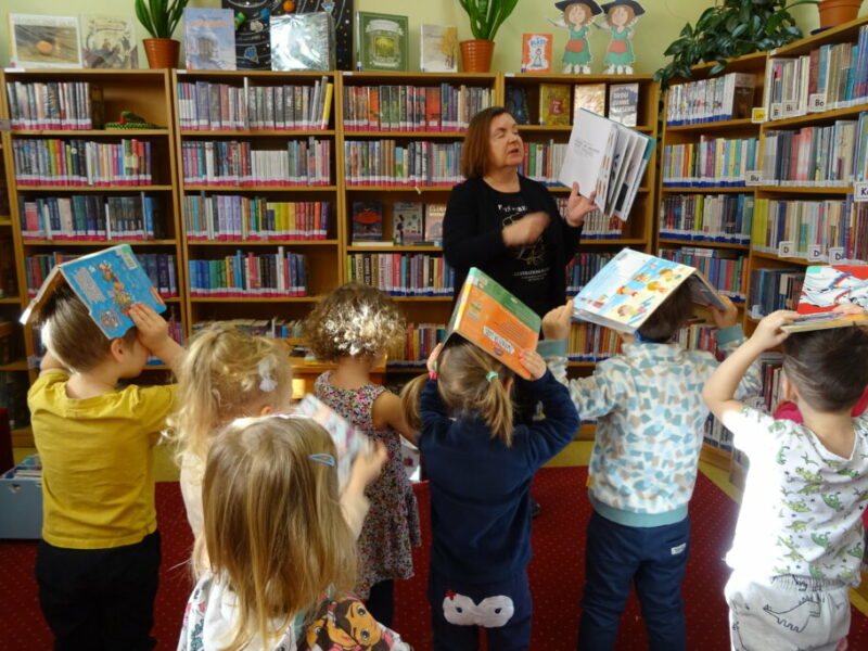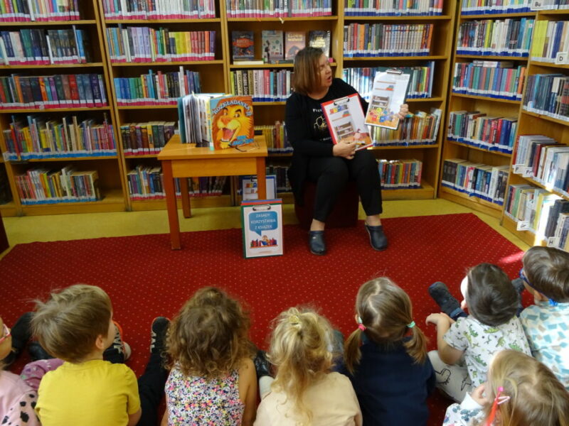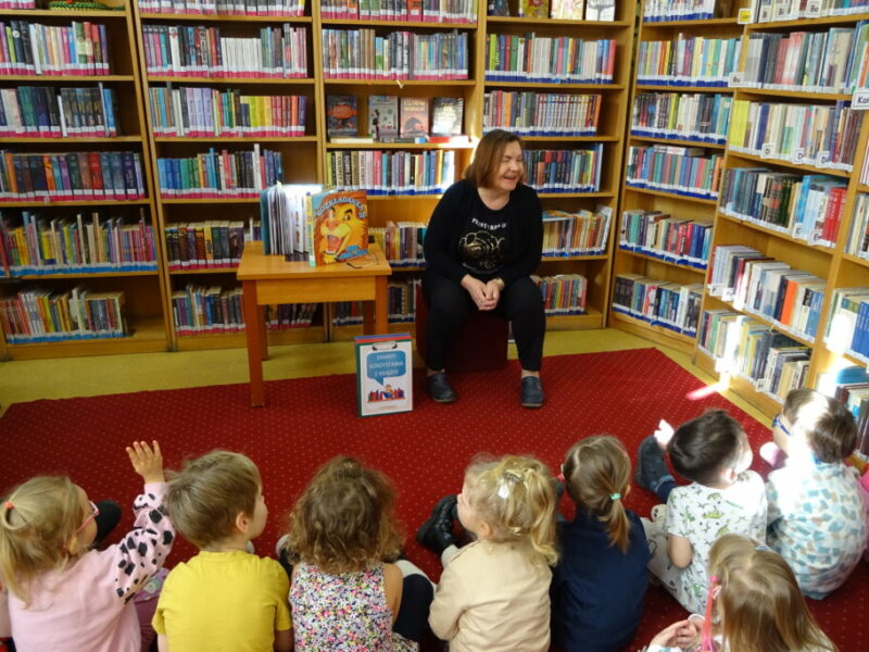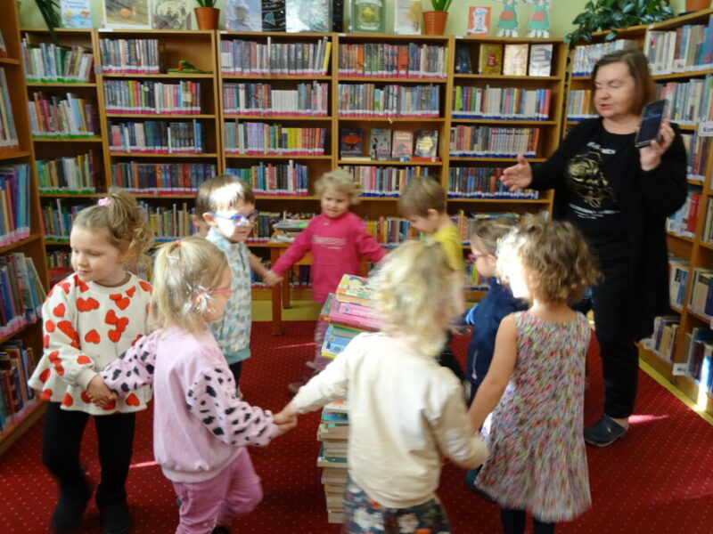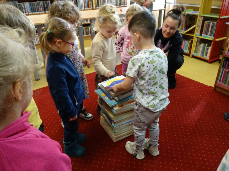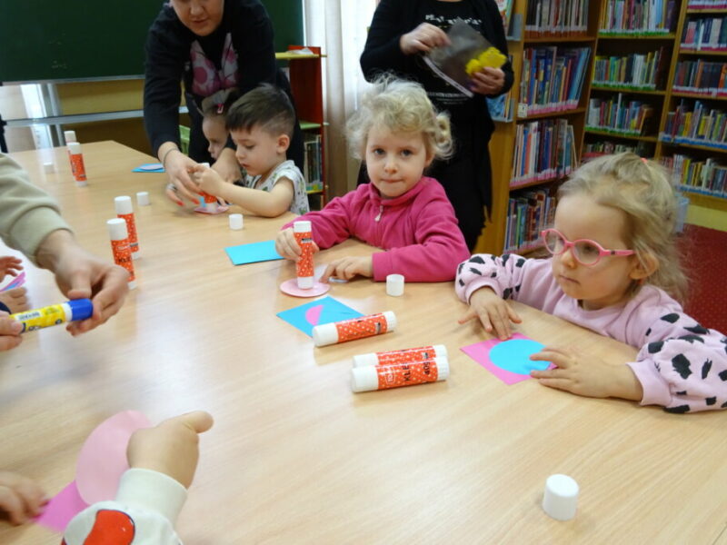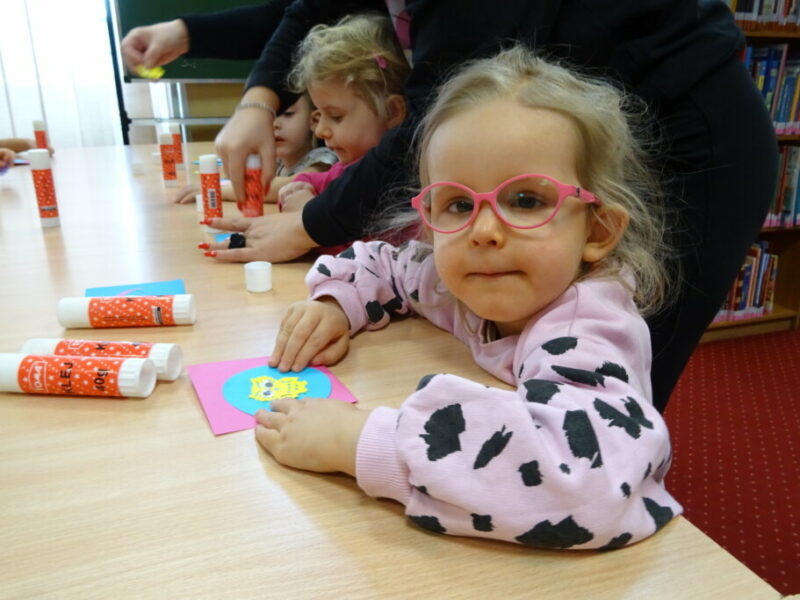 Podczas zajęć najmłodsi goście przenieśli się w magiczny świat książek. Dzieci wysłuchały wiersza Olgi Adamowicz „Smutna książeczka”, który uczy, jak dbać o książki. Gimnastykowały się i tańczyły z książeczkami oraz budowały najwyższą wieżę z książek. Wykonały również swoją pierwszą zakładkę do książki.