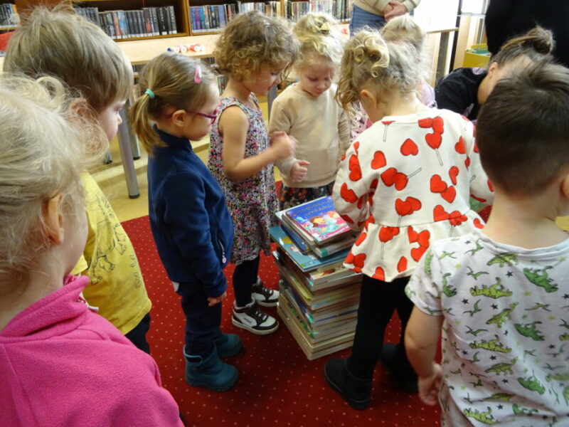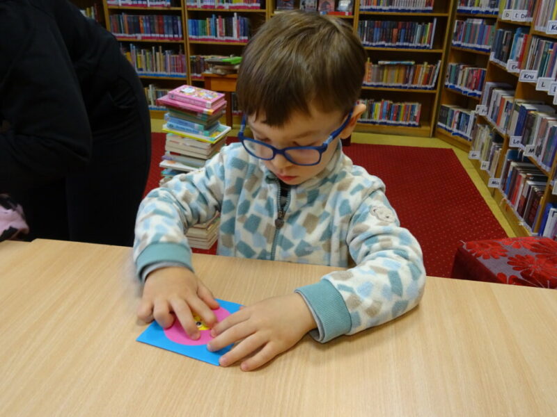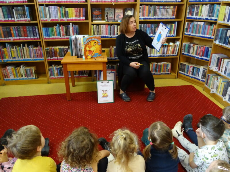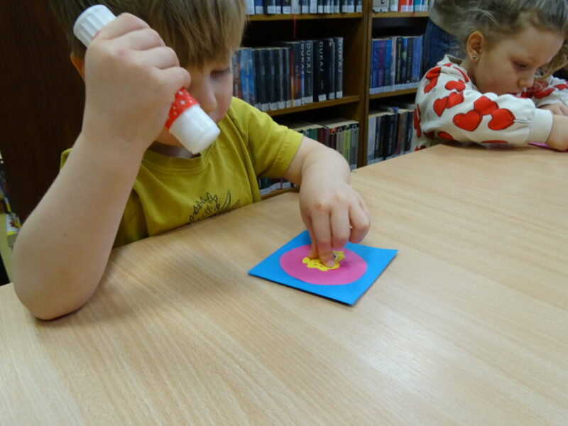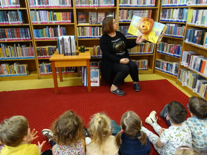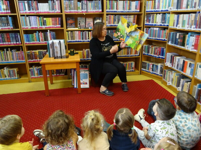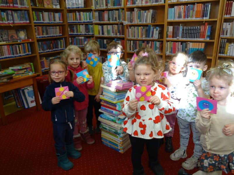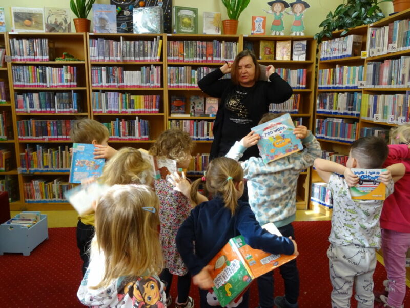 Podczas zajęć najmłodsi goście przenieśli się w magiczny świat książek. Dzieci wysłuchały wiersza Olgi Adamowicz „Smutna książeczka”, który uczy, jak dbać o książki. Gimnastykowały się i tańczyły z książeczkami oraz budowały najwyższą wieżę z książek. Wykonały również swoją pierwszą zakładkę do książki.