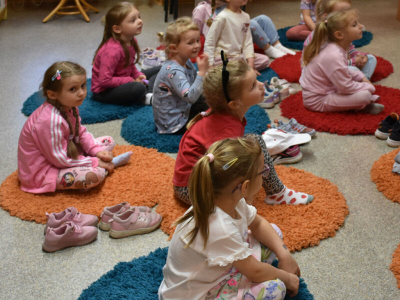 Misie z przedszkola „Zaczarowany Parasol” wysłuchały historyjki o Ryjku. Zainspirowane wesołym bohaterem, wykonały własne ilustracje nawiązujące do przeczytanej historii. Niektóre z dzieci były u nas po raz pierwszy. Miały więc okazję zapoznać się z dedykowanym im księgozbiorem.