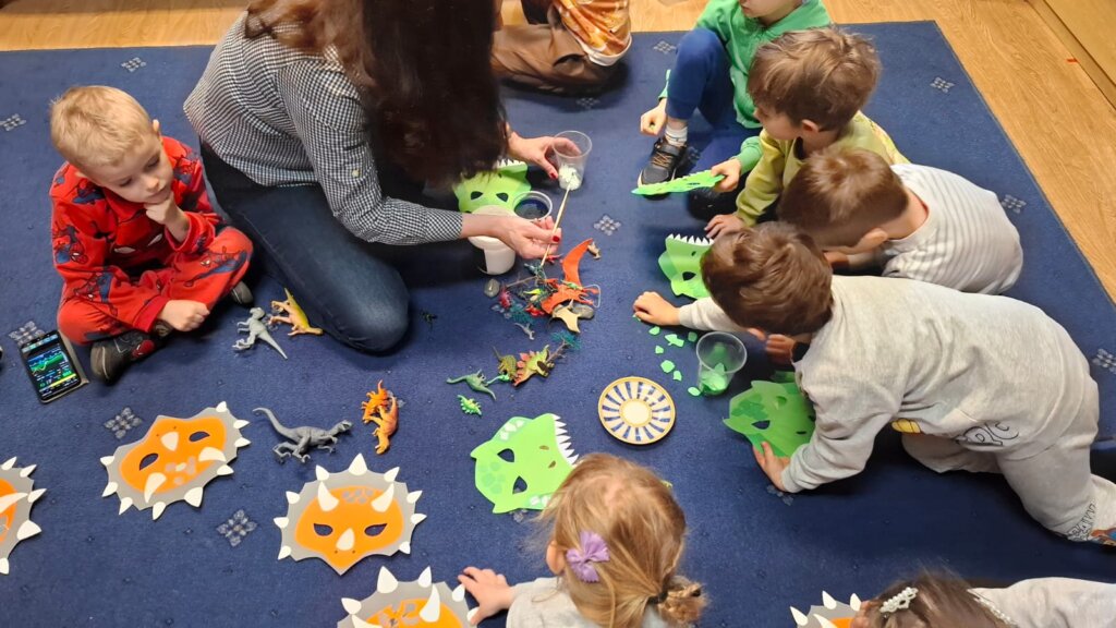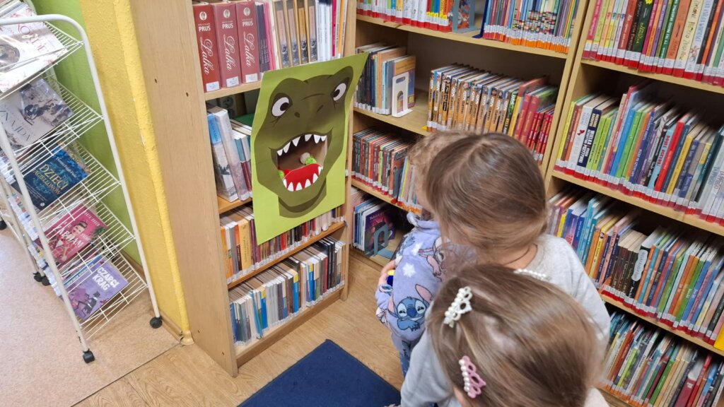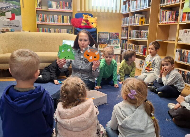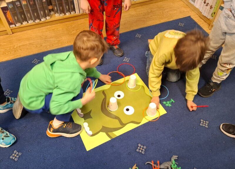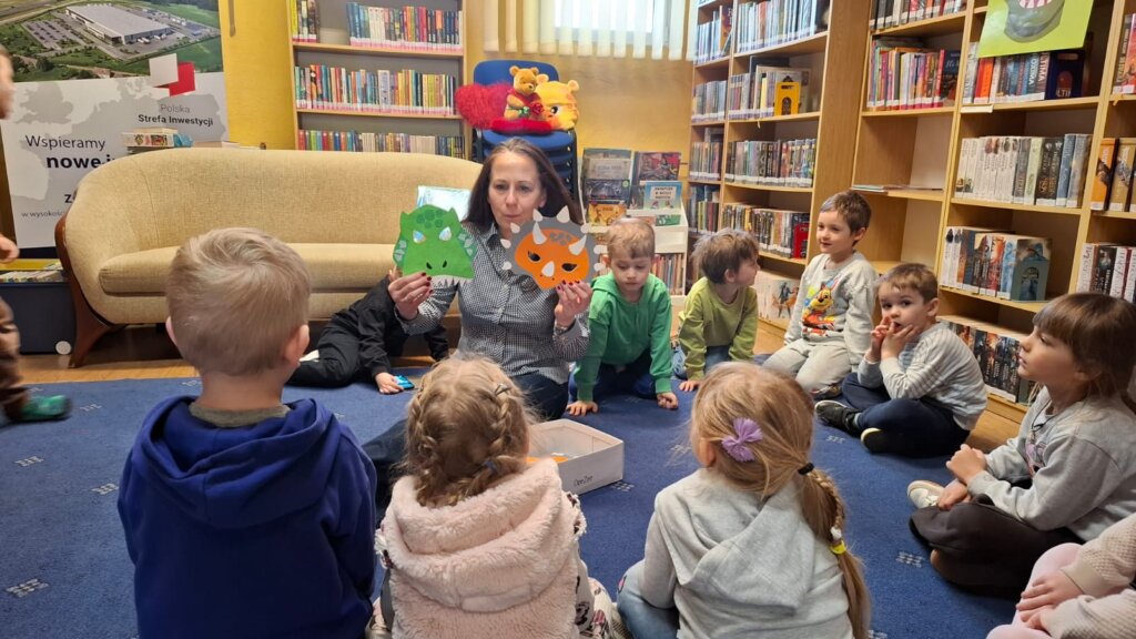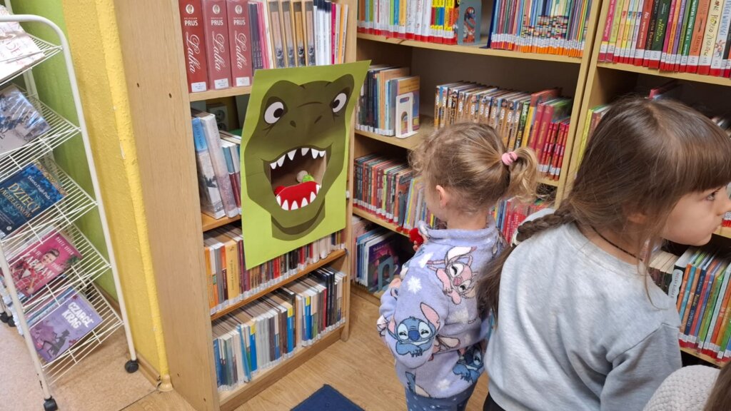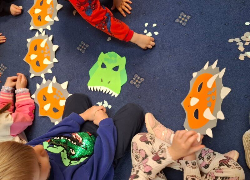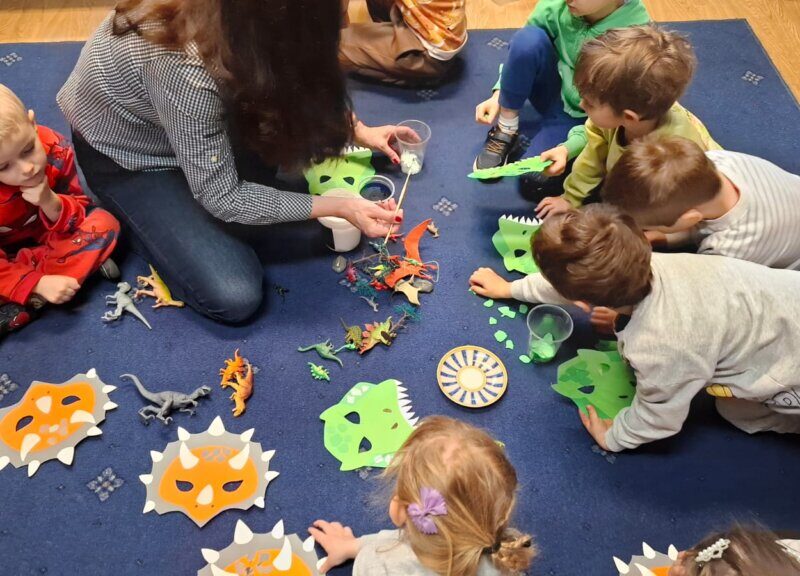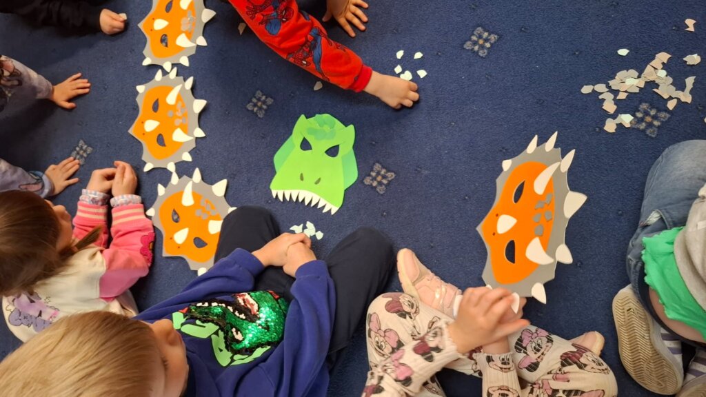 Dzieci wzięły udział w zajęciach poświęconych prehistorycznym gadom. Wysłuchały fragmentów książki Agaty Widzowskiej „Chcę być dinozaurem!”. Własnoręcznie ozdobiły dinozaurowe maski oraz grały w gry zręcznościowe z motywem dinozaurów.