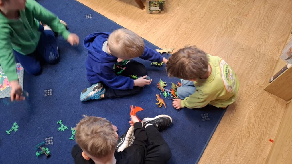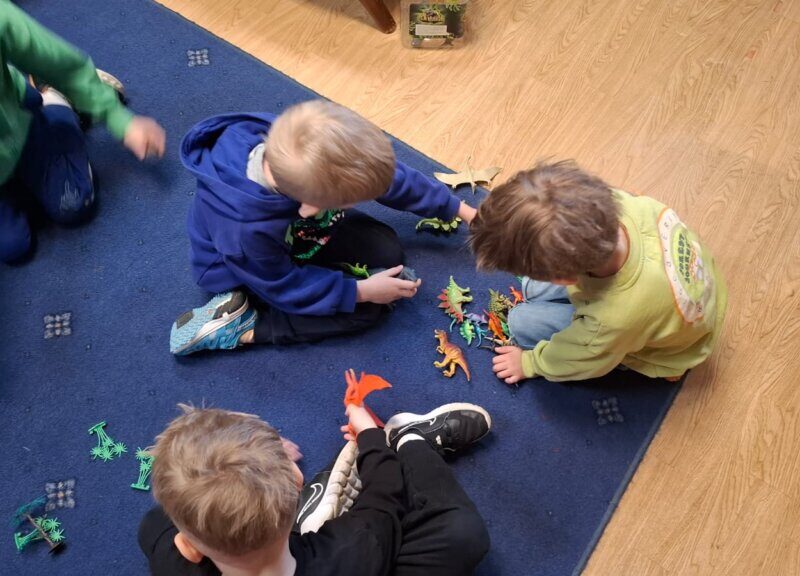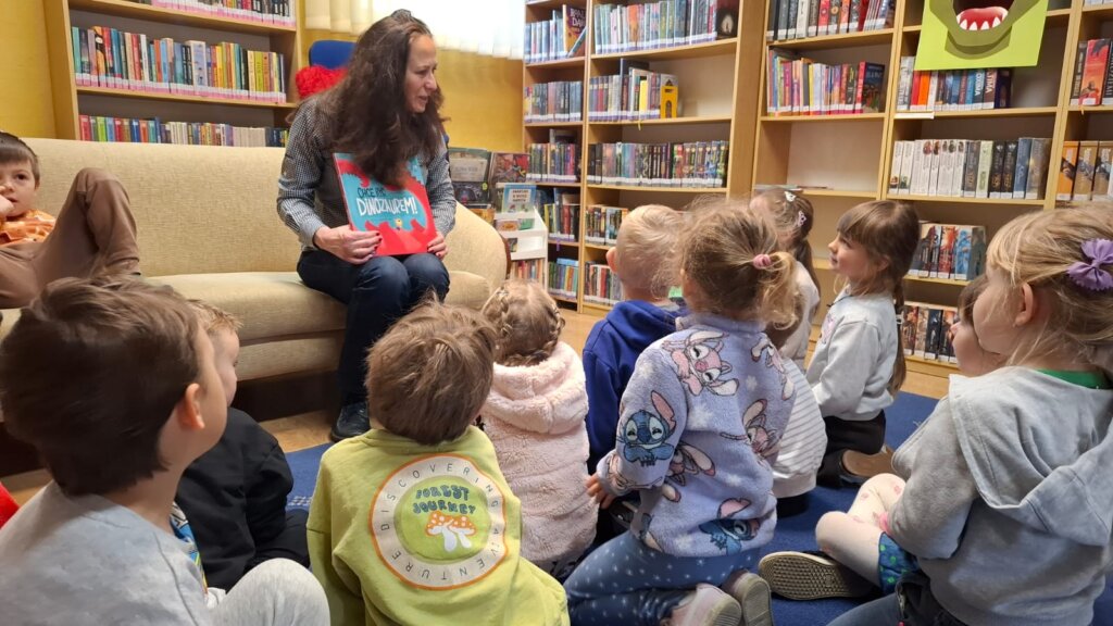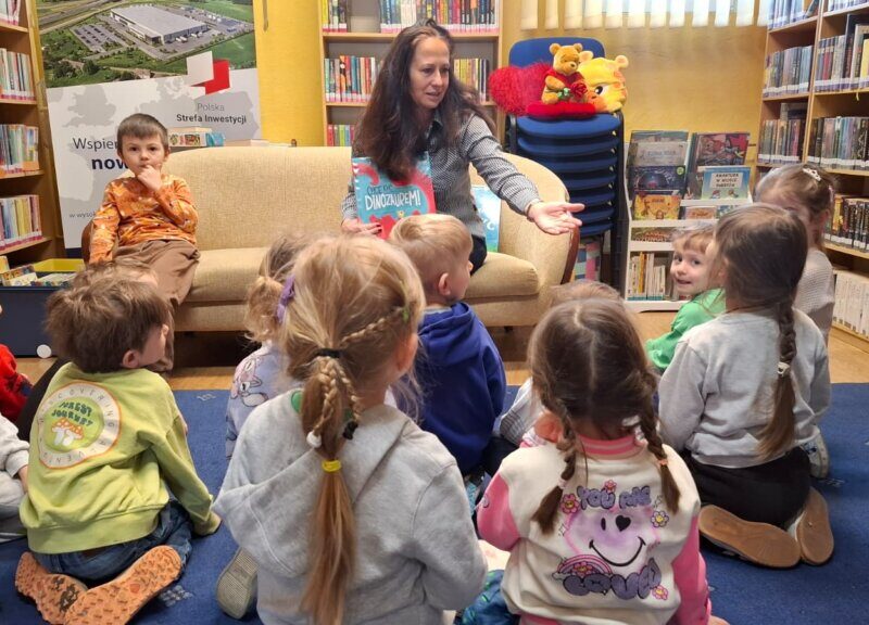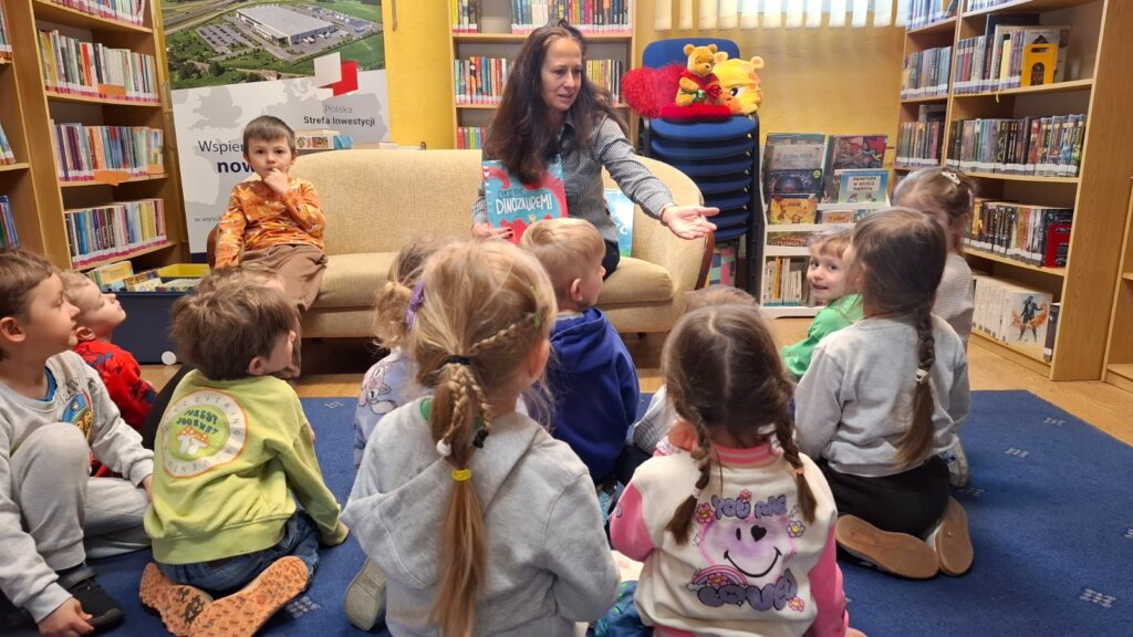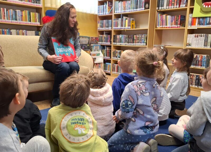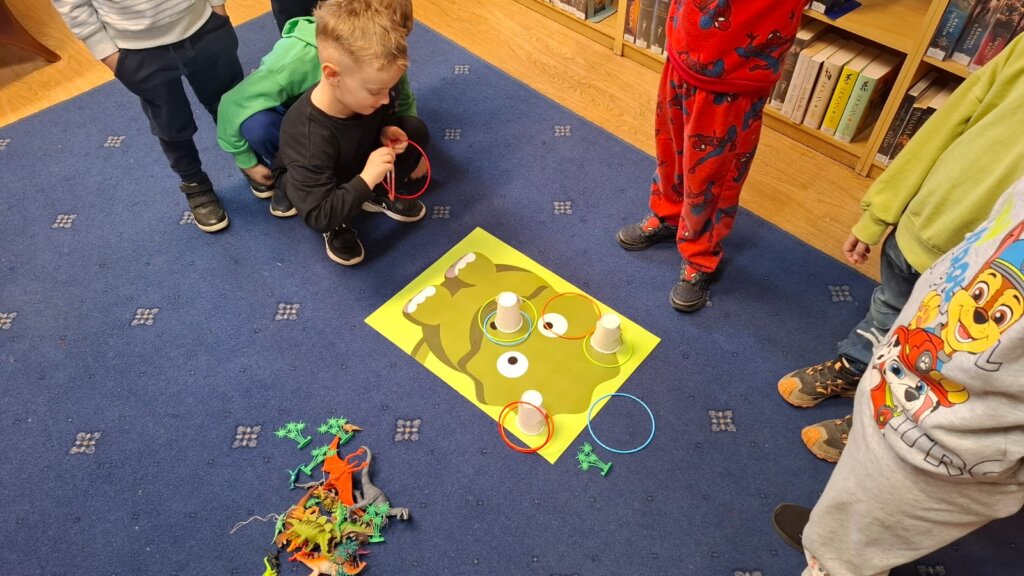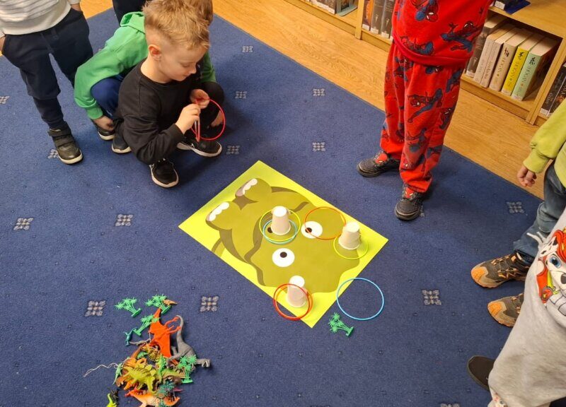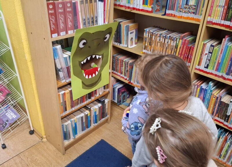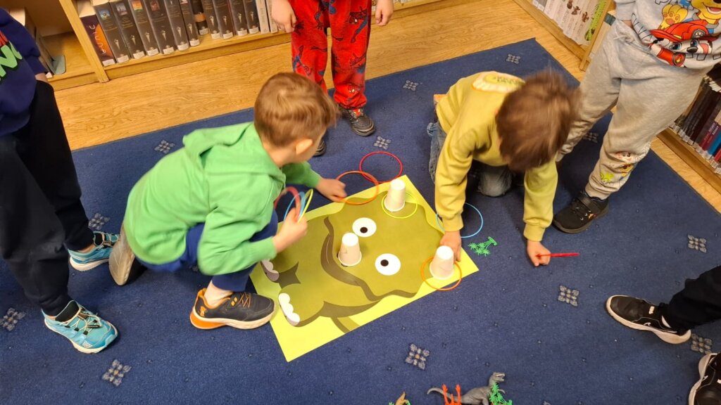 Dzieci wzięły udział w zajęciach poświęconych prehistorycznym gadom. Wysłuchały fragmentów książki Agaty Widzowskiej „Chcę być dinozaurem!”. Własnoręcznie ozdobiły dinozaurowe maski oraz grały w gry zręcznościowe z motywem dinozaurów.