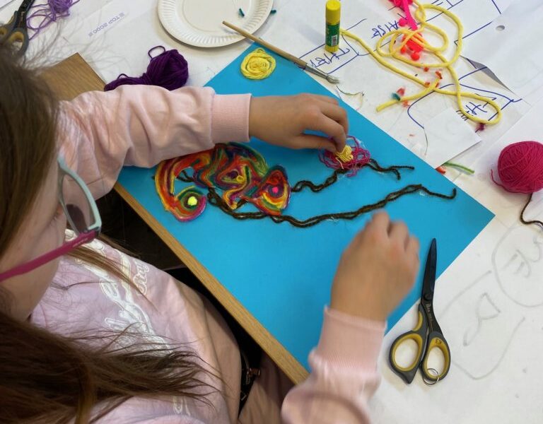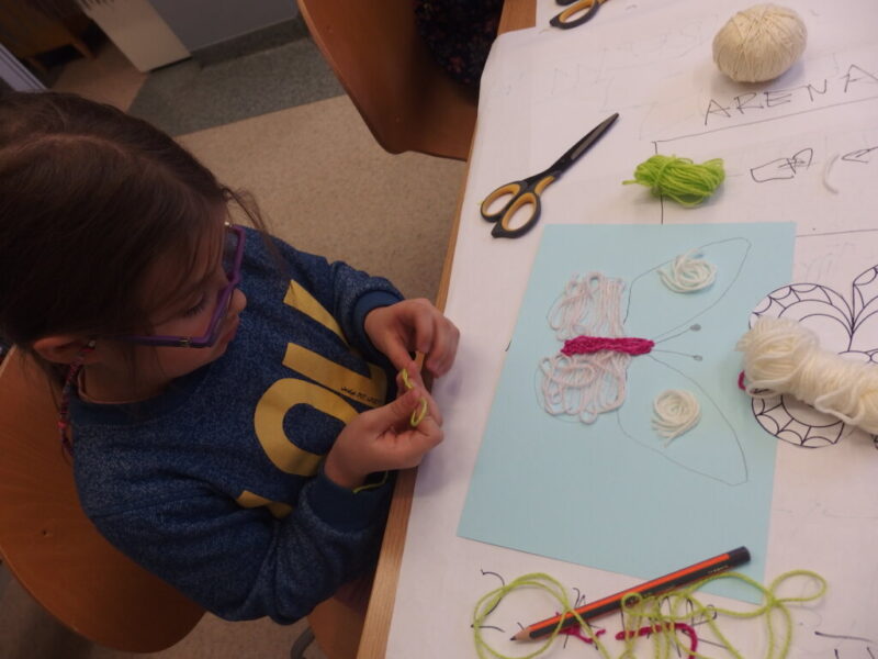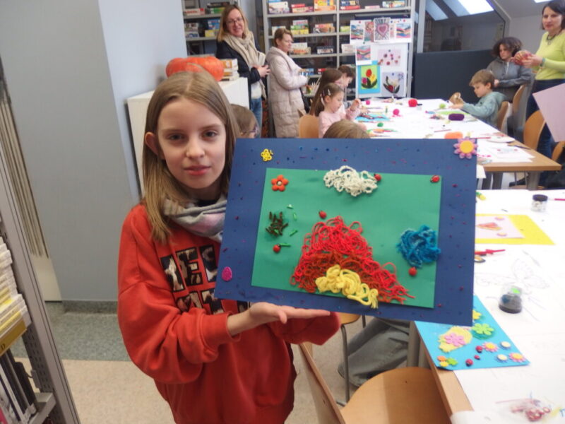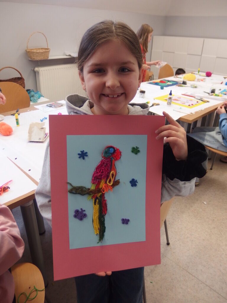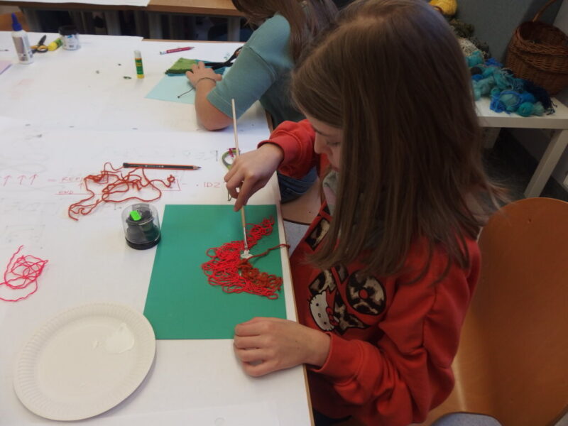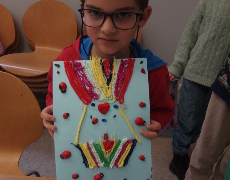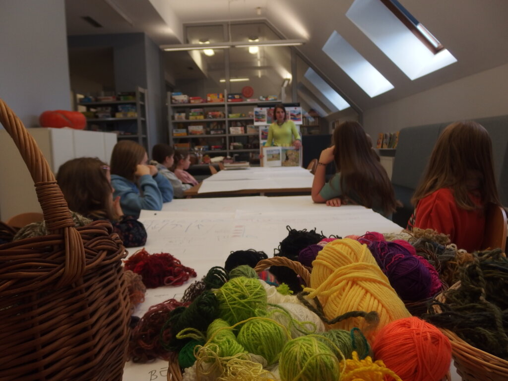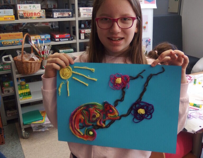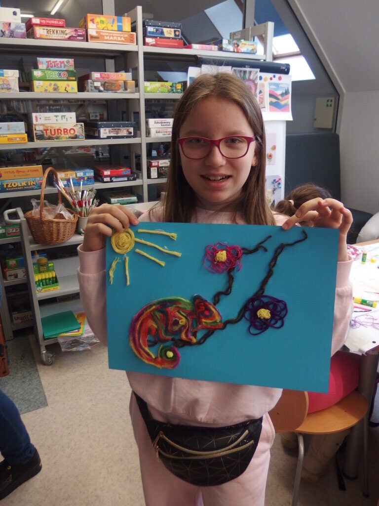 Mistrzowie malarstwa, ich sposób nakładania farby, długie pociągnięcia pędzlem były świetnym przykładem do stworzenia obrazów z włóczki. Nakładanie poszczególnych pasm wełny, komponowanie kolorów, pozwoliło stworzyć uczestnikom zajęć piękne prace. Technika nie była prosta, czasem włóczka nie „współpracowała” z pomysłem i klejem, ale udało się. Powstały wyjątkowe obrazy. Dziękujemy!