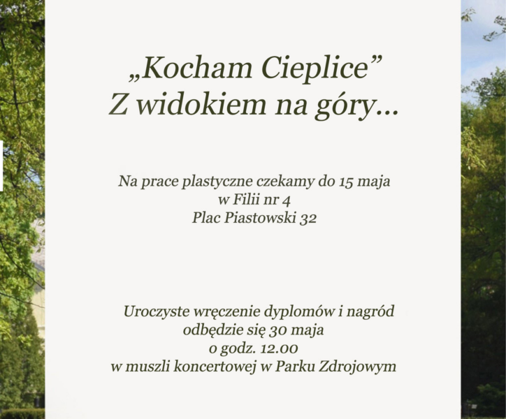 Filia nr 4 zaprasza dzieci i młodzież z przedszkoli, szkół podstawowych i średnich do udziału w XXIII edycji konkursu plastycznego „Kocham Cieplice” Z widokiem na góry... Na prace plastyczne czekamy do 15 maja 2026 r. w Filii nr 4, Plac Piastowski 32.