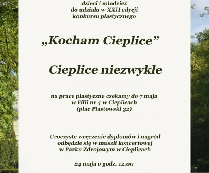 Filia nr 4 zaprasza dzieci i młodzież z przedszkoli, szkół podstawowych i średnich do udziału w XXII edycji konkursu plastycznego „Kocham Cieplice. Cieplice niezwykłe”. Tegoroczna edycja poświęcona jest wyjątkowym miejscom naszej dzielnicy. Na prace plastyczne czekamy do 7 maja 2025 r.