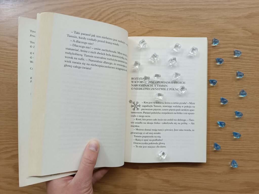 Niemiecki autor przenosi nas w zimne tereny Północy, do XIX wieku. Nie będziemy jednak wiele podróżować, cała akcja książki ma miejsce w przeznaczonym dla znamienitych gości Hotelu Aurora oraz chwilowo w pałacu samej Królowej Śniegu (tej z baśni Andersena, choć już nieco podstarzałej i osłabionej sprytną kradzieżą). Pełna mroźnego powiewu i wirujących płatków historia skupia się na postaci dwunastoletniej sieroty, którą wszyscy nazywają Mysz. Dziewczynka nie ma lekkiego życia, przez co cała powieść, choć okraszona uśmiechem i kolorami czarodziejki Tamsin Spellwell, jest dość przygnębiająca, nawet jeżeli doczekamy się w niej i pozytywnych rozwiązań.