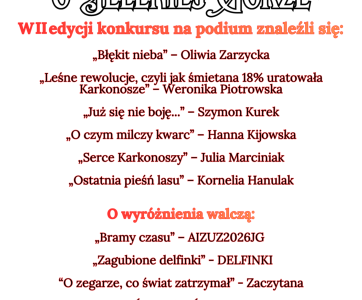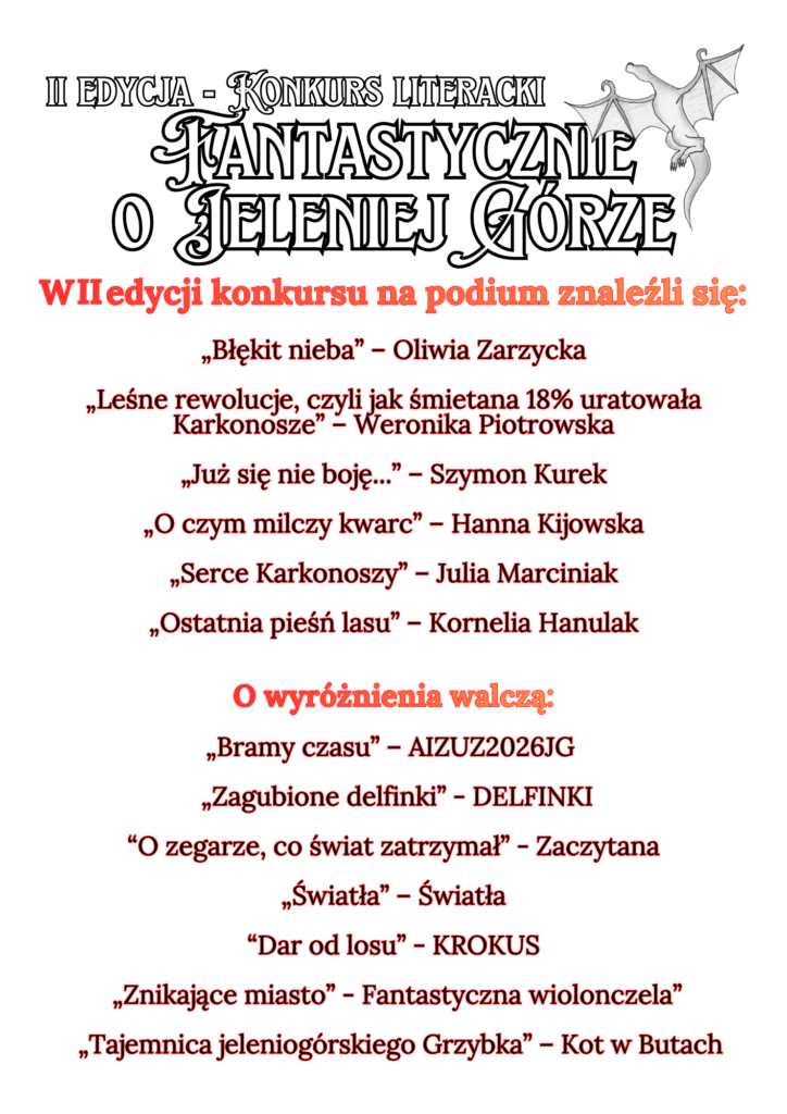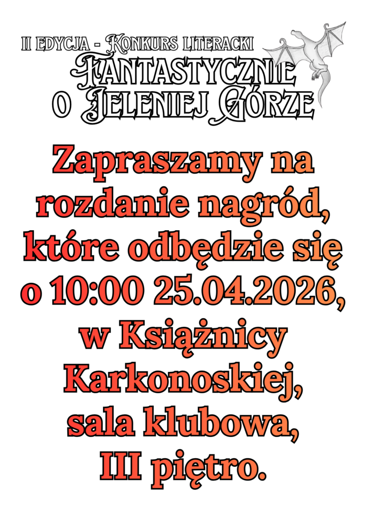 To była piękna podróż przez fantazje uczestników, którą chcemy ukoronować uroczystym rozdaniem nagród. Wszystkich zainteresowanych zapraszamy w tę sobotę, 25 kwietnia, na godz. 10:00 do Sali Klubowej Książnicy Karkonoskiej (ul. Bankowa 27, III piętro). W planie również odczytywanie fragmentów przesłanych utworów oraz poczęstunek.