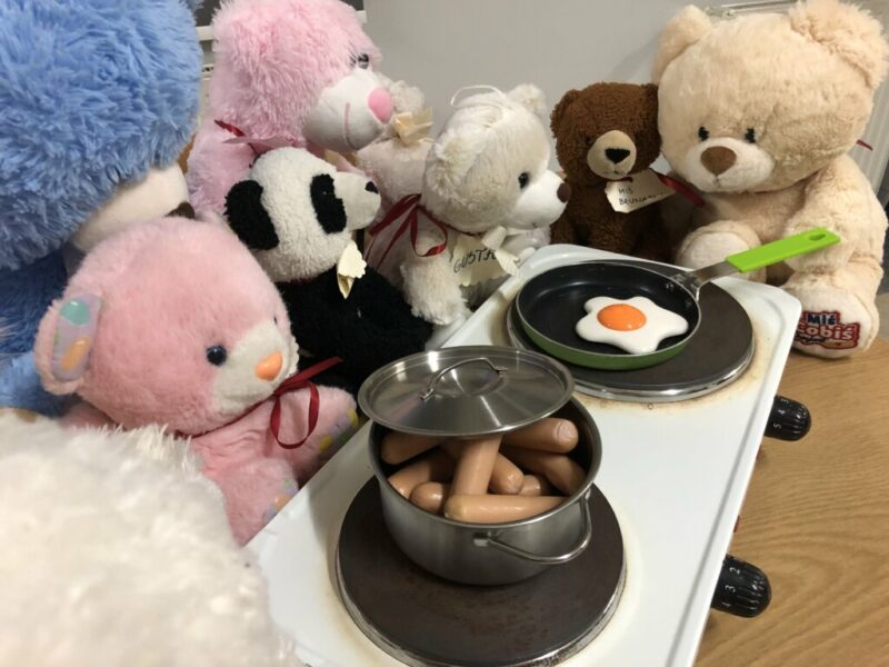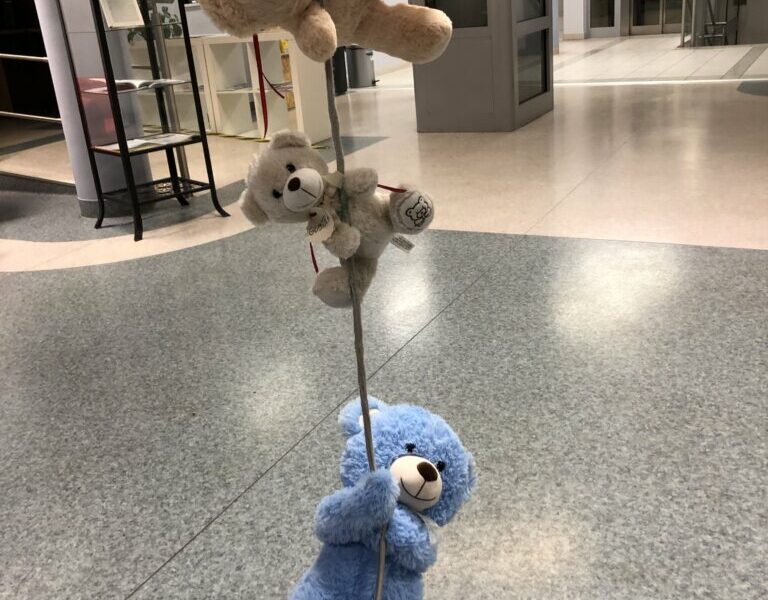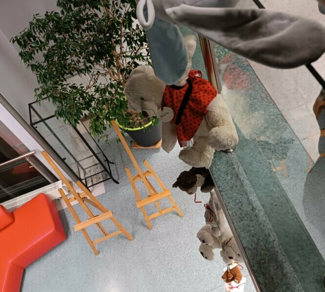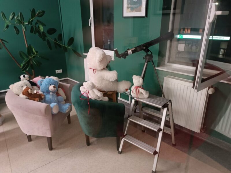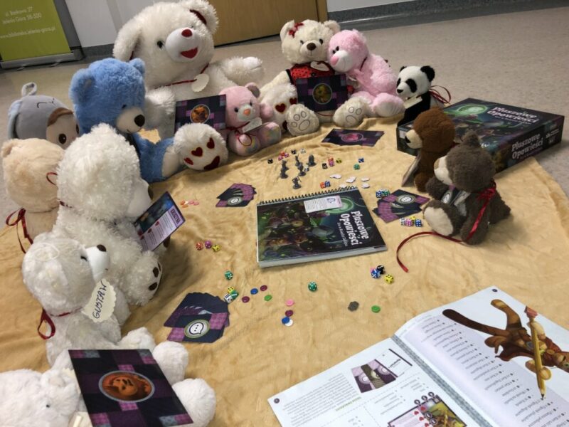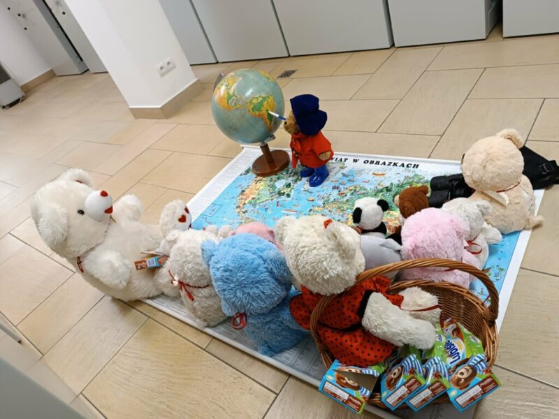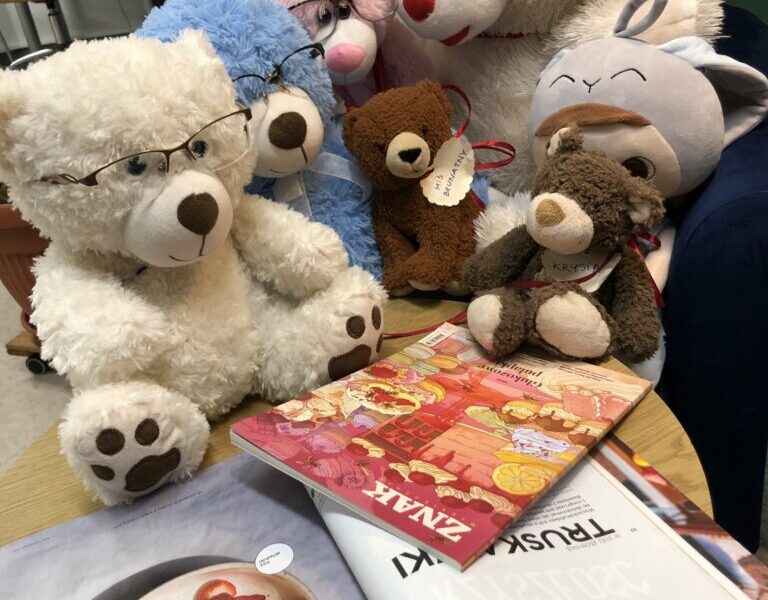Początkowo misie ostrożnie wychyliły się ze swojej „sypialni”, by sprawdzić, czy nikt nie patrzy. Kiedy upewniły się, że w bibliotece panuje cisza, ruszyły między regały. Najpierw wymyśliły „misiowe zawody” – kto szybciej znajdzie książkę z niedźwiedziem na okładce i tak misie odwiedziły swoich literackich przyjaciół: Kubusia Puchatka, Padingtona, Misia Remisia i inne miśki, z którymi wspólnie poczytali książki.