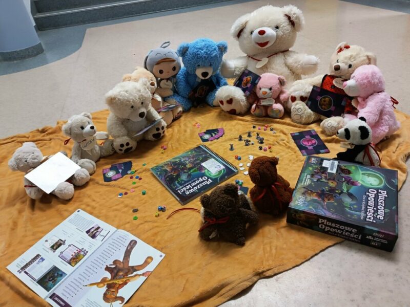 Oczywiście nie obyło się bez psot: ktoś rozsypał kredki, inny rozłożył grę planszową, a jeszcze jeden spróbował wdrapać się na biblioteczne regały. Największy pluszak – Miś Kajtek – zaproponował w końcu wycieczkę po wszystkich działach. I tak zaczęło się nocne zwiedzanie.