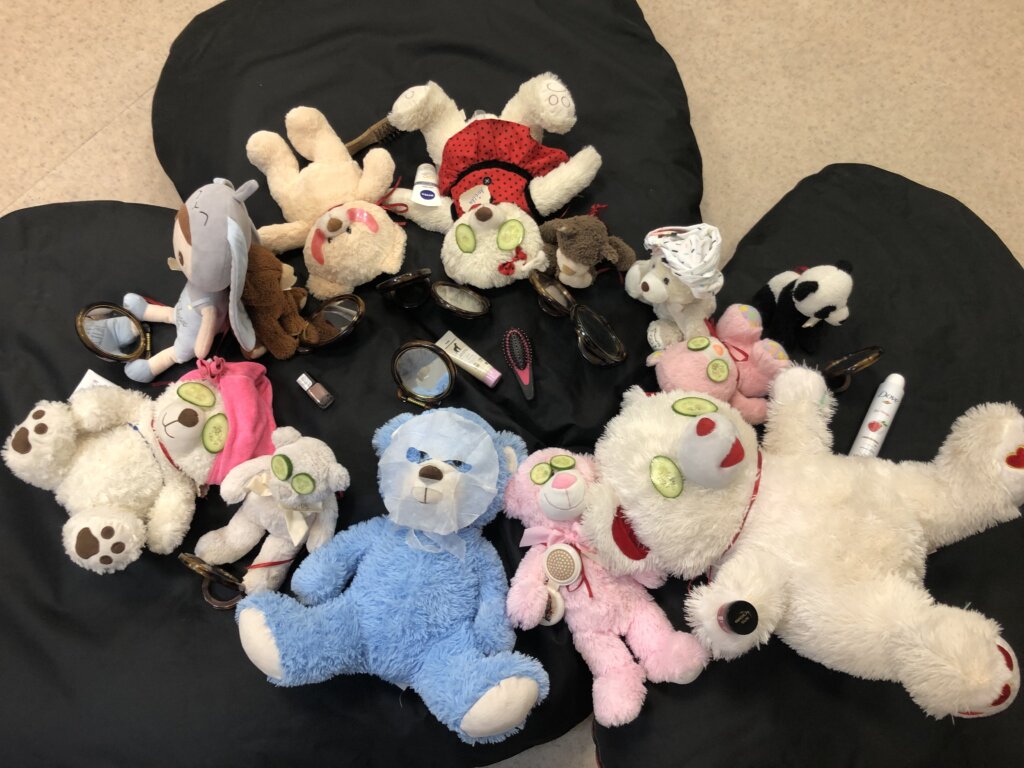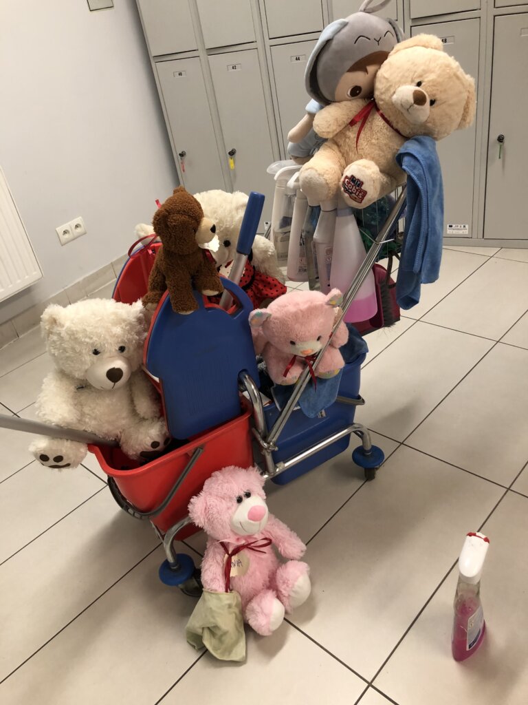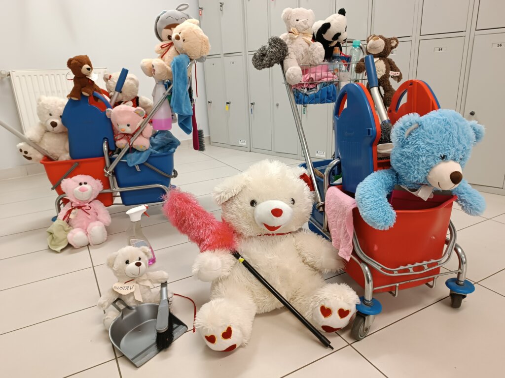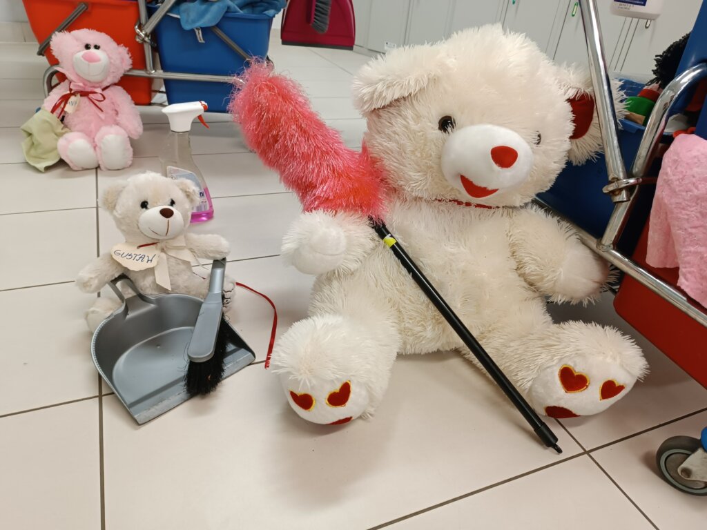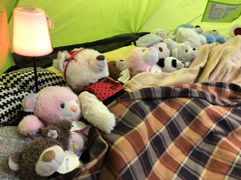 Rano bibliotekarze zastali ślady nocnej przygody: rozsypane kredki, otwarte książki i podejrzanie przechylone maskotki. Jednak wszyscy wiedzą, że to tylko dowód na to, jak wspaniale bawiły się nasze pluszaki.