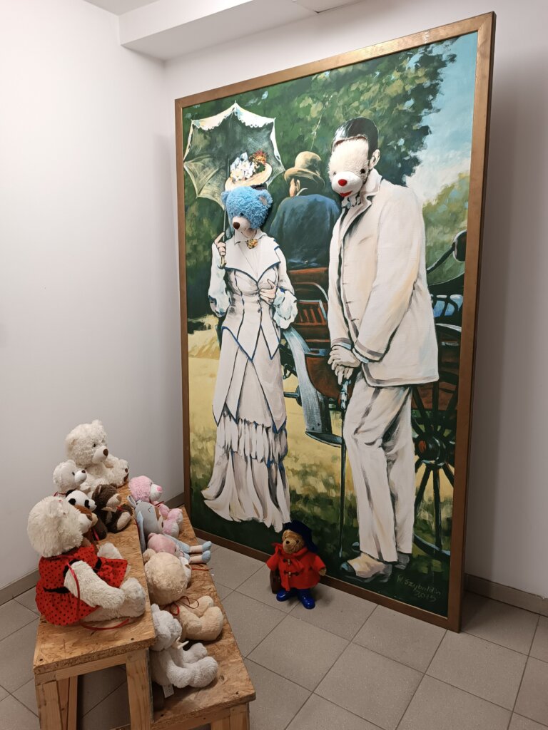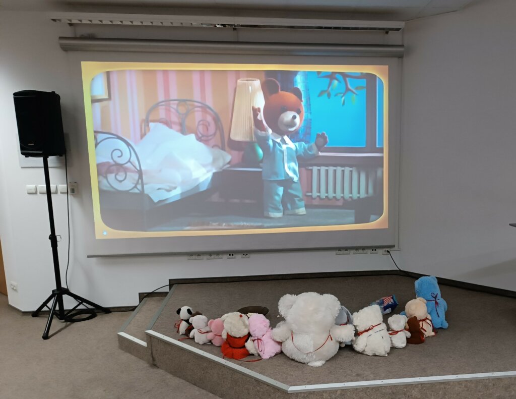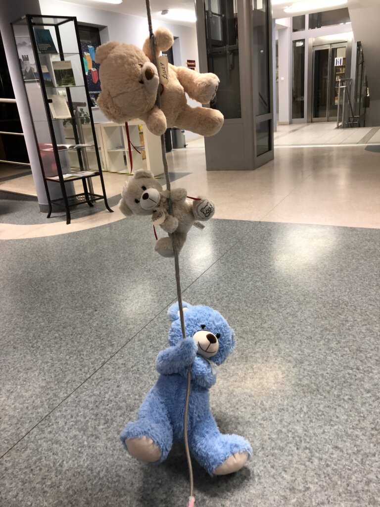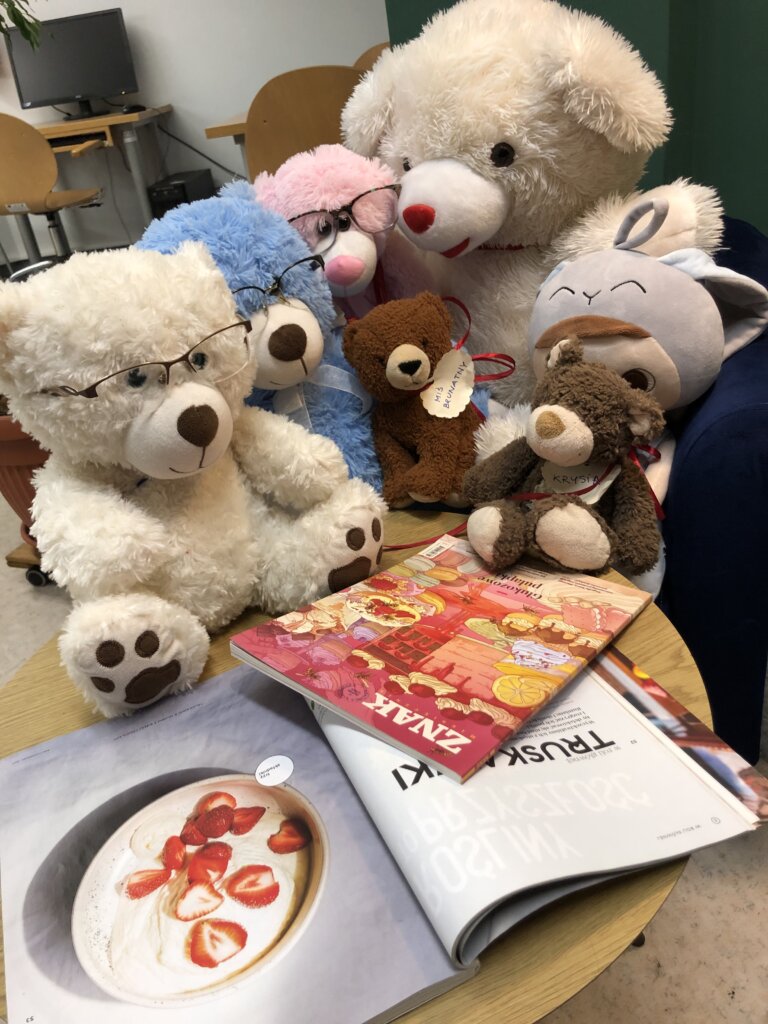 Początkowo misie ostrożnie wychyliły się ze swojej „sypialni”, by sprawdzić, czy nikt nie patrzy. Kiedy upewniły się, że w bibliotece panuje cisza, ruszyły między regały. Najpierw wymyśliły „misiowe zawody” – kto szybciej znajdzie książkę z niedźwiedziem na okładce i tak misie odwiedziły swoich literackich przyjaciół: Kubusia Puchatka, Padingtona, Misia Remisia i inne miśki, z którymi wspólnie poczytali książki.