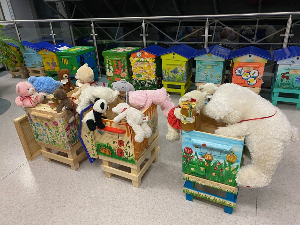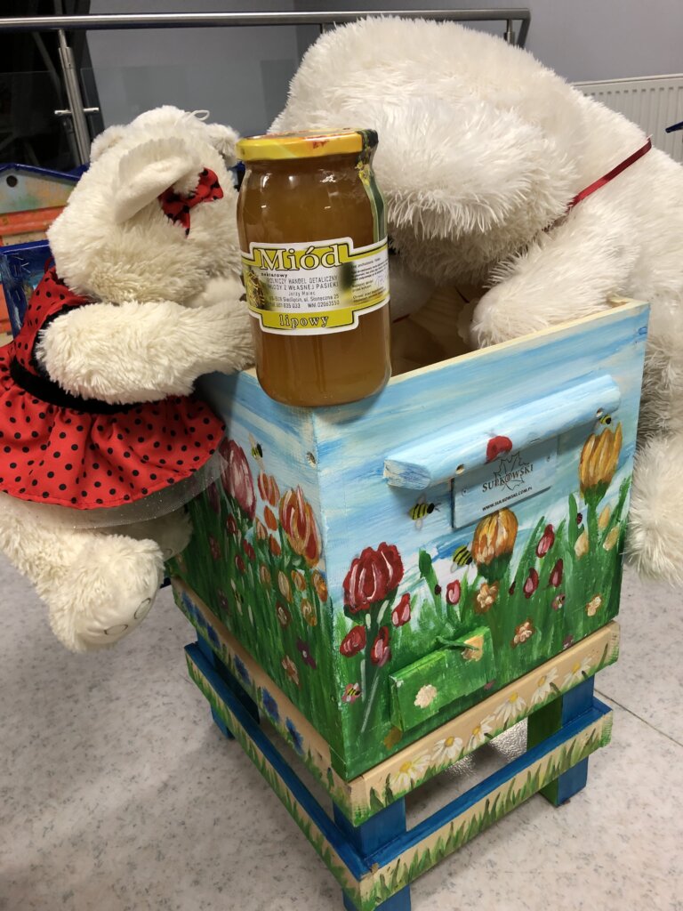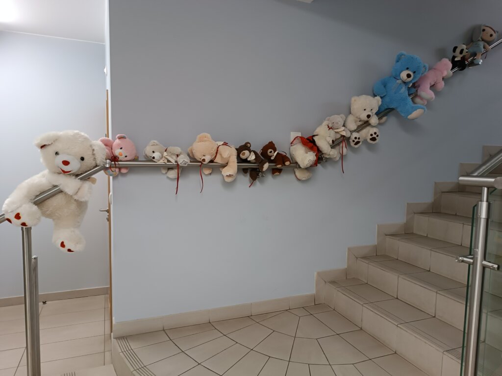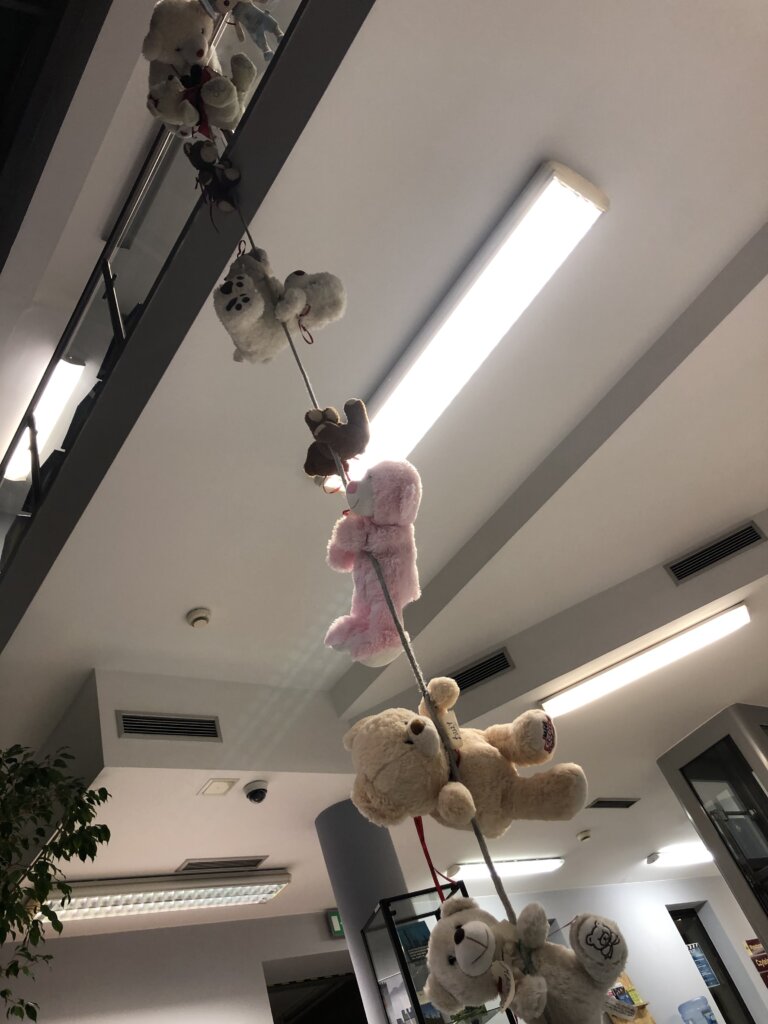 Początkowo misie ostrożnie wychyliły się ze swojej „sypialni”, by sprawdzić, czy nikt nie patrzy. Kiedy upewniły się, że w bibliotece panuje cisza, ruszyły między regały. Najpierw wymyśliły „misiowe zawody” – kto szybciej znajdzie książkę z niedźwiedziem na okładce i tak misie odwiedziły swoich literackich przyjaciół: Kubusia Puchatka, Padingtona, Misia Remisia i inne miśki, z którymi wspólnie poczytali książki.