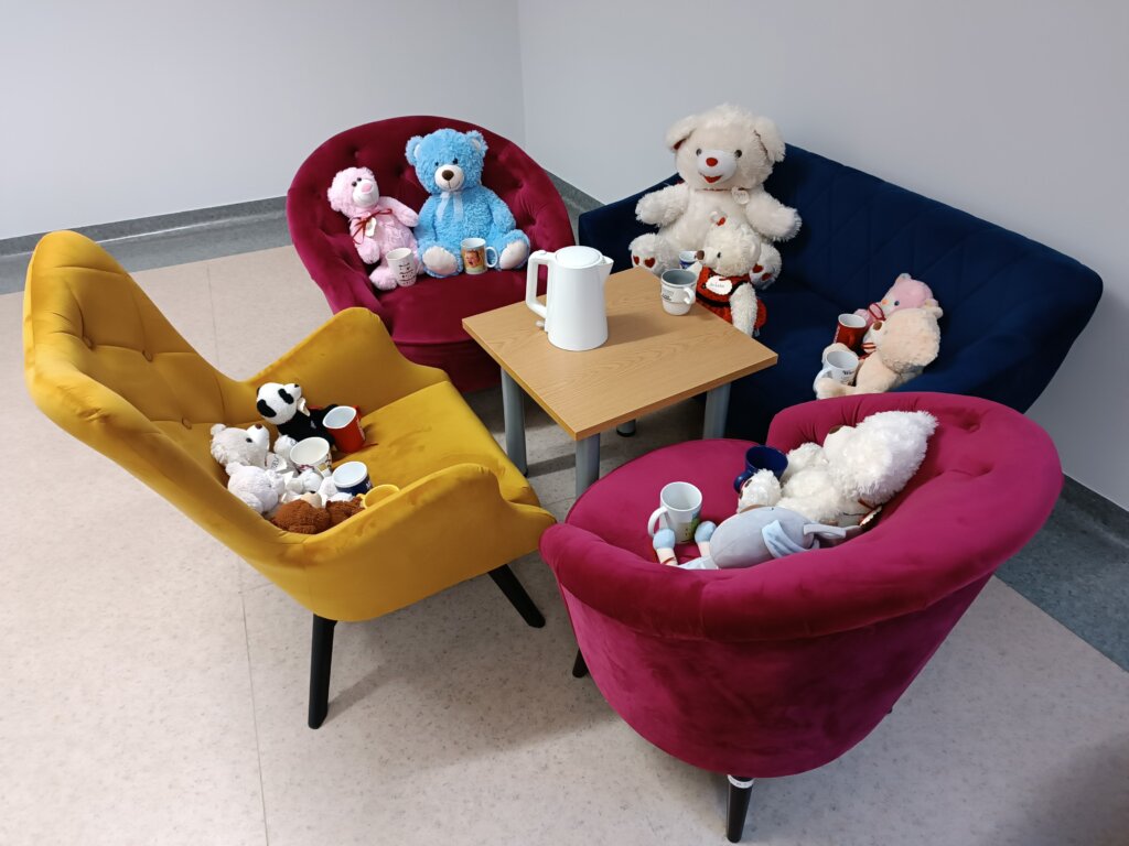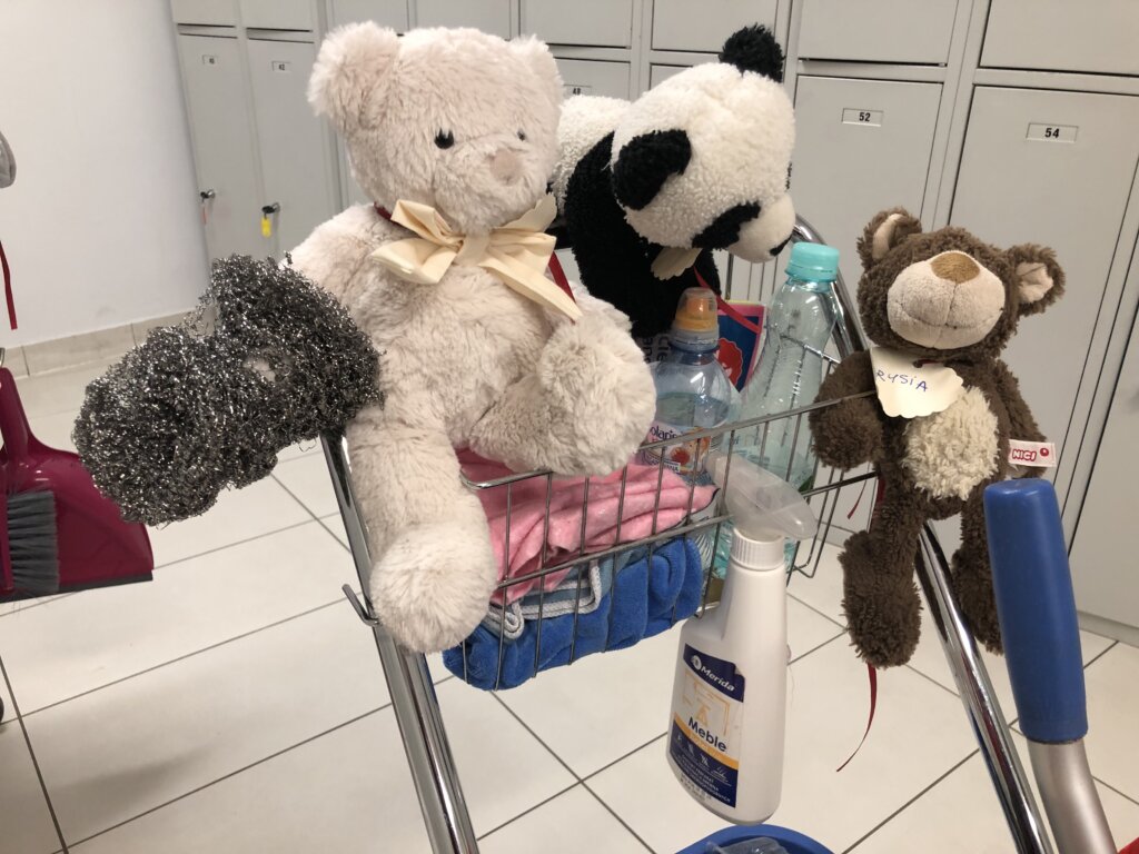 Oczywiście nie obyło się bez psot: ktoś rozsypał kredki, inny rozłożył grę planszową, a jeszcze jeden spróbował wdrapać się na biblioteczne regały. Największy pluszak – Miś Kajtek – zaproponował w końcu wycieczkę po wszystkich działach. I tak zaczęło się nocne zwiedzanie.