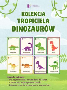 🦖 Kolekcja tropiciela dinozaurów – zdobądź unikalną kartę z dinozaurem! Do zebrania aż 8 kart. Zasady zabawy na plakacie.