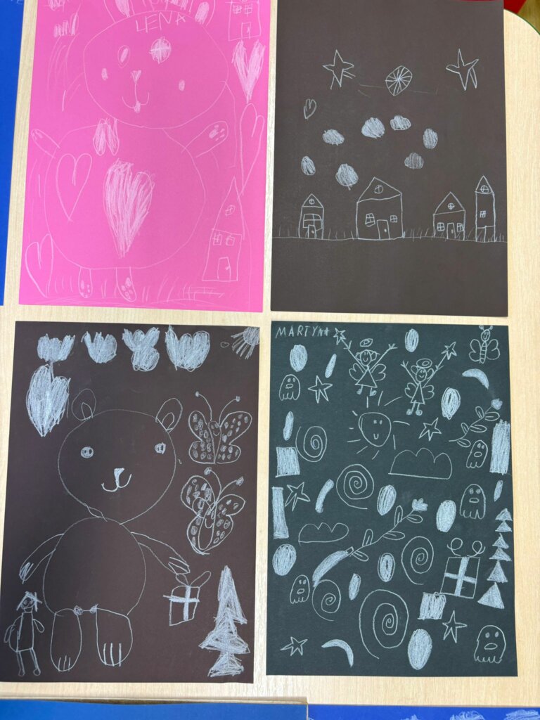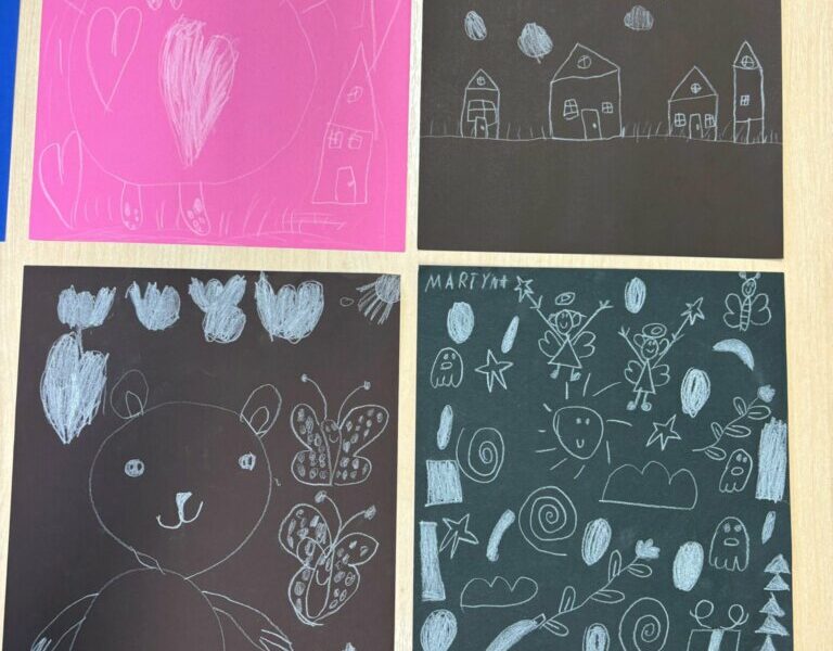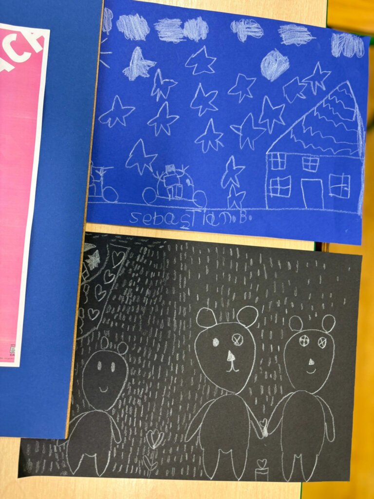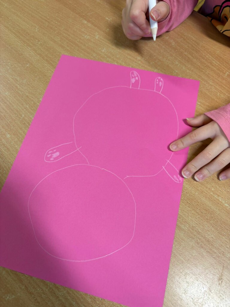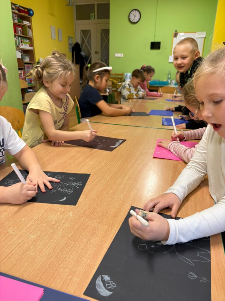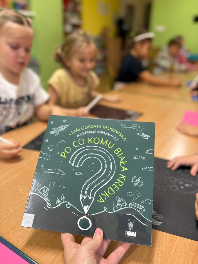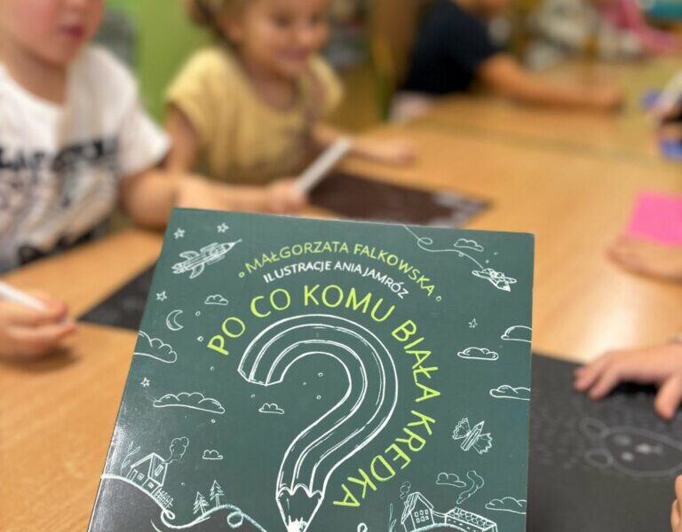 Dzisiejsze spotkanie w ramach Dyskusyjnego Klubu Książki „Fraszka” upłynęło na poszukiwaniu odpowiedzi na pytanie: do czego właściwie służy biała kredka? Dzieci zgodnie stwierdziły, podobnie jak Zuzia, bohaterka książki Małgorzaty Falkowskiej pt. „Po co komu biała kredka?”, że białej kredki nie widać, gdy się nią rysuje po białym papierze.