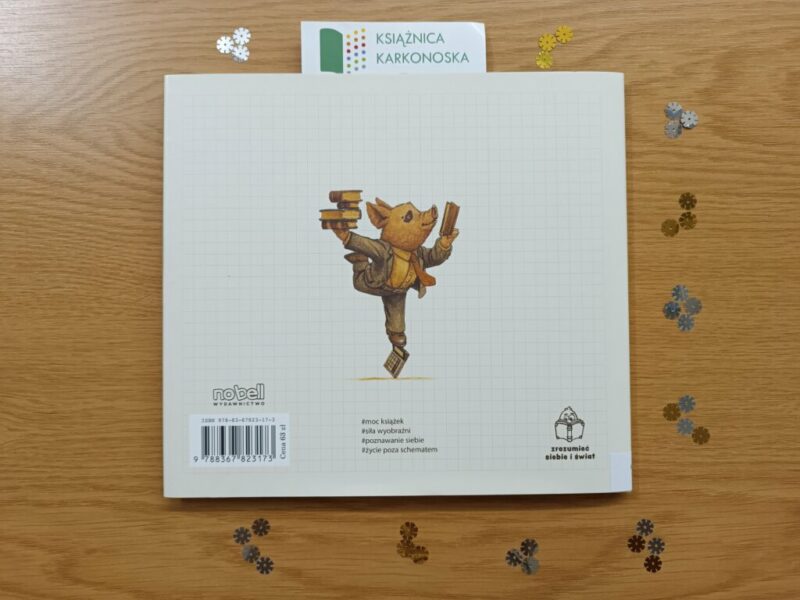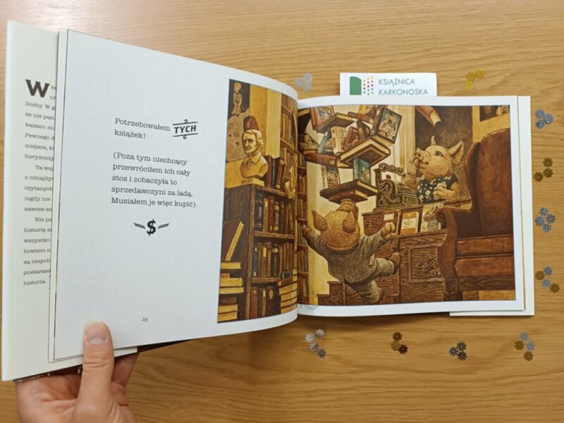 Ciekawe, że autor pośród ludzi umieścił i dwa prosiaki (główny bohater i sprzedawczyni w księgarni) oraz wilka (srogi, narzucający swoje zdanie szef). Każda ilustracja jest dobrze przemyślana i zawiera tylko te elementy (niektóre z nich wyraźnie symboliczne), które mają tworzyć wyraźny przekaz. Choć przy tym szczegółów na niektórych jest naprawdę wiele.  Rysunki w książce są wykonane w przytłumionych kolorach, dających efekt sepii. Tekst umieszczono na kartkach przypominających zeszyt w kratkę, a duża, czytelna czcionka w kilku miejscach zmienia się w element graficzny podkreślający ważne w fabule słowa. Nawet numery stron są nieco pokrętne, by wymykać się ze schematów.