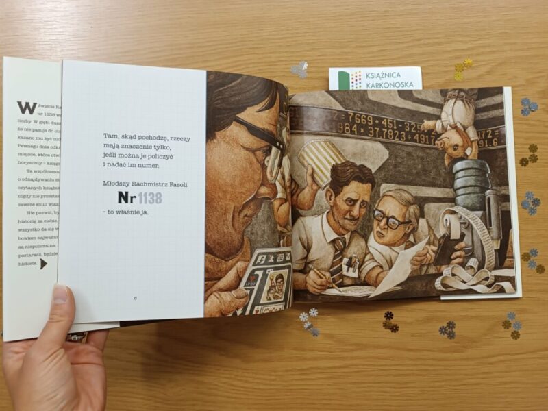 Intrygująco-niepokojąca, jakby wydarta ze świata totalitaryzmu, historia o Młodszym Rachmistrzu Fasoli nr 1138. Tam, gdzie żądzą liczby, nie ma miejsca na marzenia oraz to, co nadzwyczajne i nieznane. Książka graficzna Zacka Rocka to krótka współczesna przypowieść o odnajdywaniu swojego miejsca w świecie i przestroga przed zawężaniem myślenia tylko do tego, co narzucają nam inni. Bo czasem warto porzucić znaną, bezpieczną historię, by odkryć tę prawdziwie SWOJĄ, znacznie lepiej do nas dopasowaną. Jest to również opowieść o potędze książek, które otwierają nam głowę na to, co mogłoby być, a także pomagają fantazjować w szarej rzeczywistości.