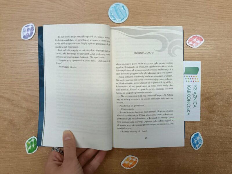 Opisy podmorskiego królestwa, pomysły na metamorfozy smoków i na lustrzane więzienie niezwykle mi się podobały. Same sposoby wykorzystywania wprowadzanych przez Lim rekwizytów są godne szczególnej uwagi, dzięki nim historia jest bardzo spójna i płynnie przechodzi do kolejnych wydarzeń. Autorka sprytnie wymusiła powrót do tak charakterystycznego, znanego z poprzedniego tomu czaru, a to nie jedyny wątek, który nawiązuje do pierwszej części (przykładowo poznamy lepiej tak mglistą przeszłość Raikamy). Między stronami znajdziemy i sporo „mrugnięć” w stronę czytelnika znającego inną książkę Elizabeth Lim – „Tkając Świt”, której fabuła toczy się sporo lat po przygodach Shiori.