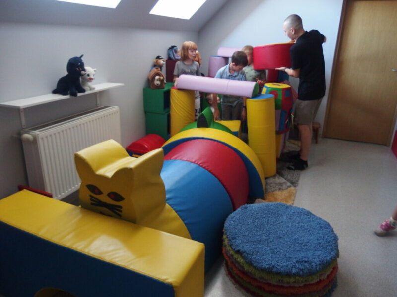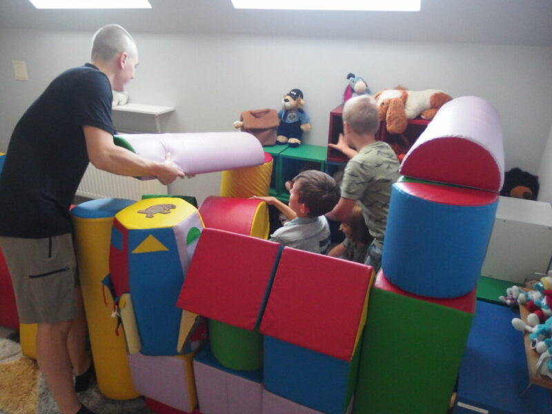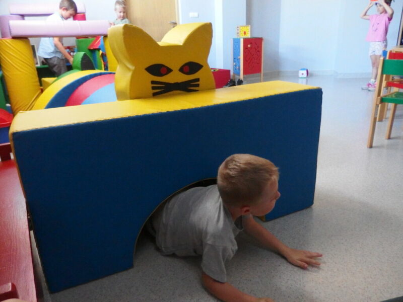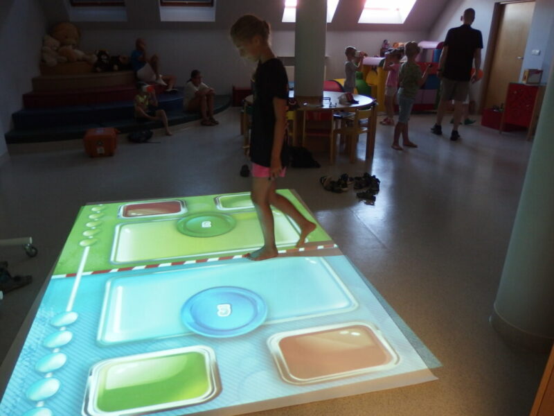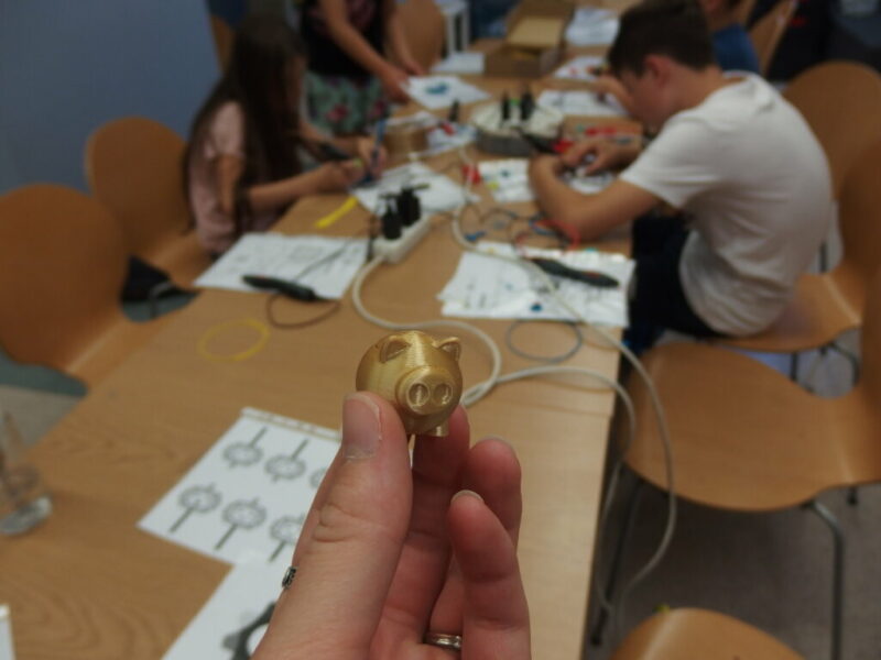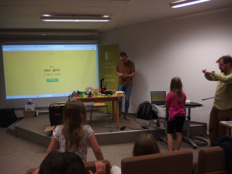 22 i 29 sierpnia, po części wykładowej, powstały kolejne, tym razem już bardziej funkcjonalne projekty, jak okulary, sztućce i pudełeczka. Pokazywane były także wydrukowane w różnych kolorach serduszka, świnki i żabki, które mogą posłużyć za ciekawe gadżety i pamiątki. Poza interaktywnymi, wyświetlanymi na podłodze naszej czytelni dla najmłodszych grami, wśród których pojawiły się te sprawnościowe, koordynacyjne lub edukacyjne, dużym zainteresowaniem cieszyły się również nasze piankowe klocki, z których uczestnicy warsztatów zbudowali prawdziwą fortecę!