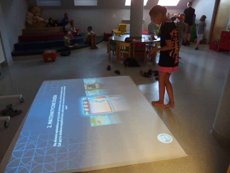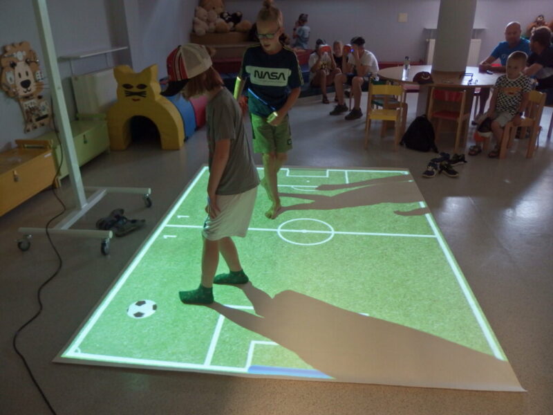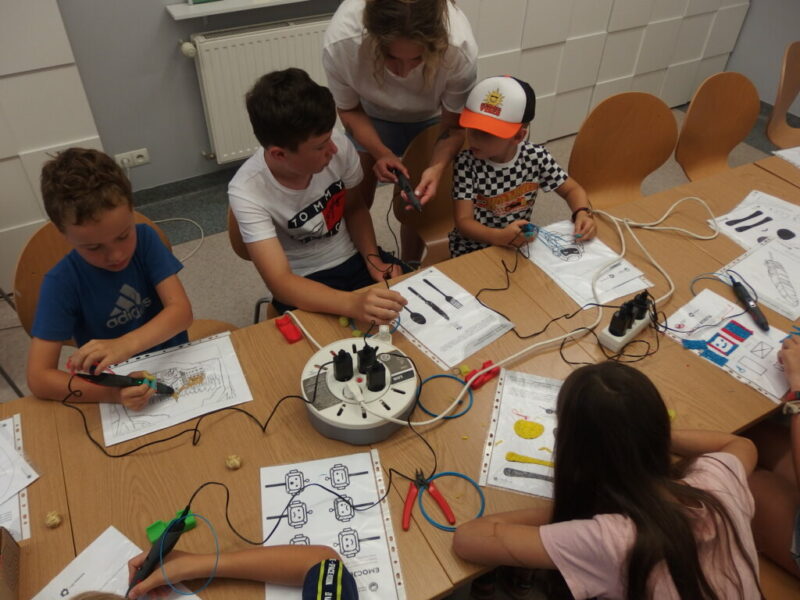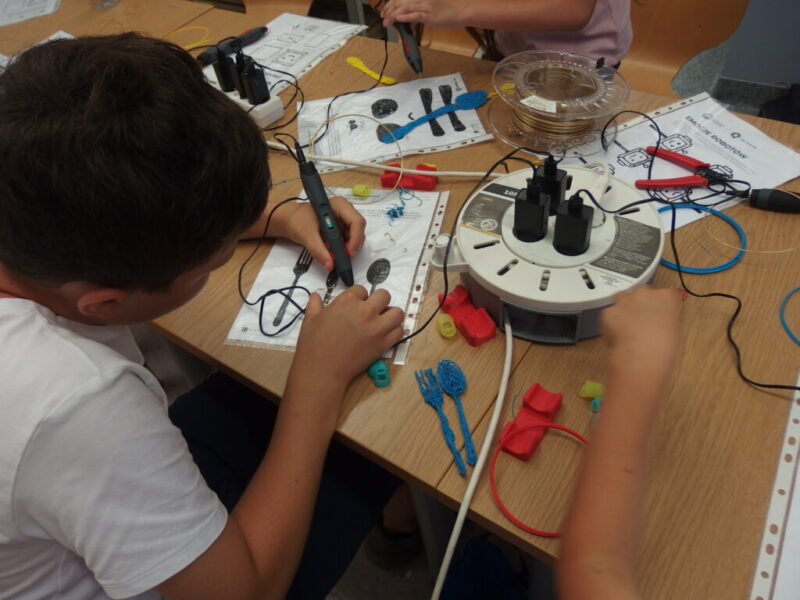 25 lipca prezentowane były różne, kolorowe figurki stworzone z pomocą drukarki 3D wraz z objaśnieniami zasad jej działania. Poza nimi pojawiły się również części i przedmioty użytku codziennego, choć te nie wzbudziły już tak wielu dziecięcych „ochów” i „achów”, to pokazały jak funkcjonalnym i perspektywicznym przedmiotem może być taka drukarka. Uczestniczy mieli też możliwość pierwszych zabaw z goglami VR i skoordynowaną z rzutnikiem interaktywną matą do gier. Brzmi skomplikowanie? A było po prostu świetną zabawą! Powstały także pierwsze drukowane projekty – motylki, grzybki czy lody w wafelku.